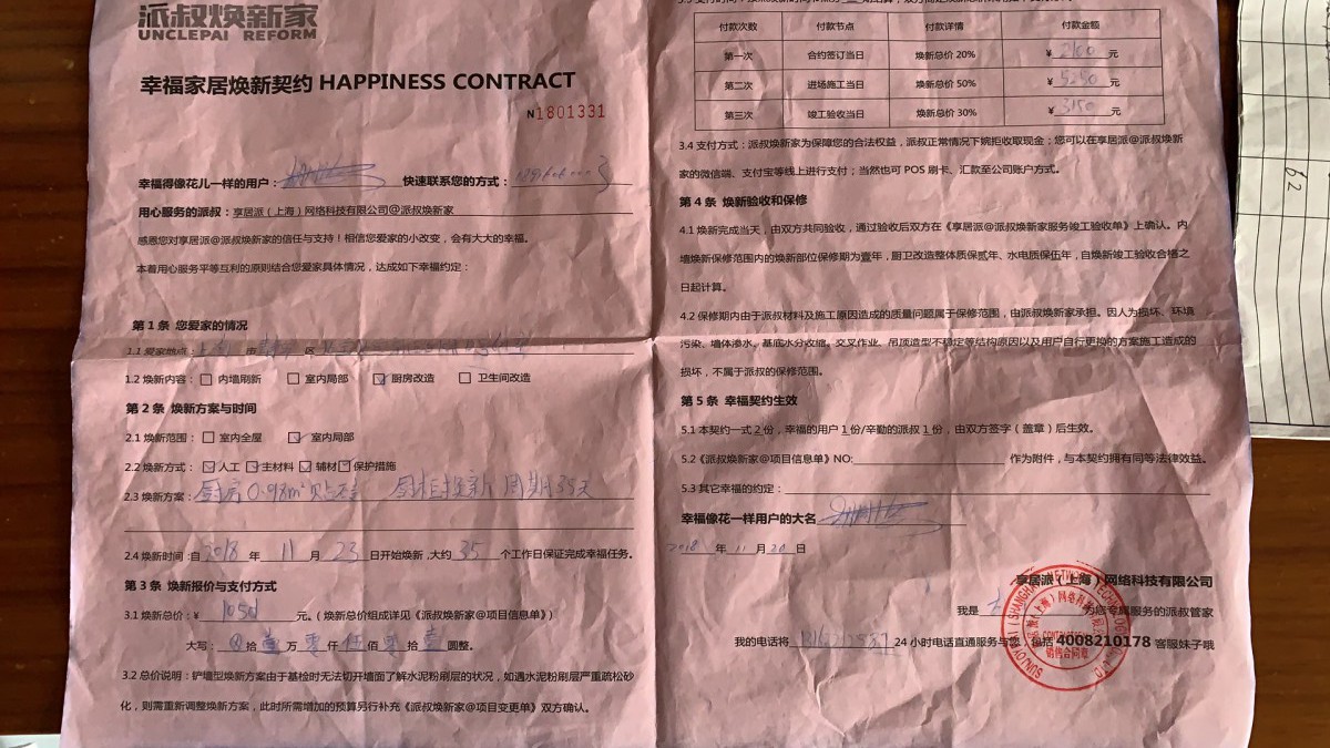 | 投訴類型 | 施工質(zhì)量 | 投訴人 | 胡** | 被投訴單位 | 享居派上海網(wǎng)絡(luò)科技有限公司下屬-派叔煥新家 |