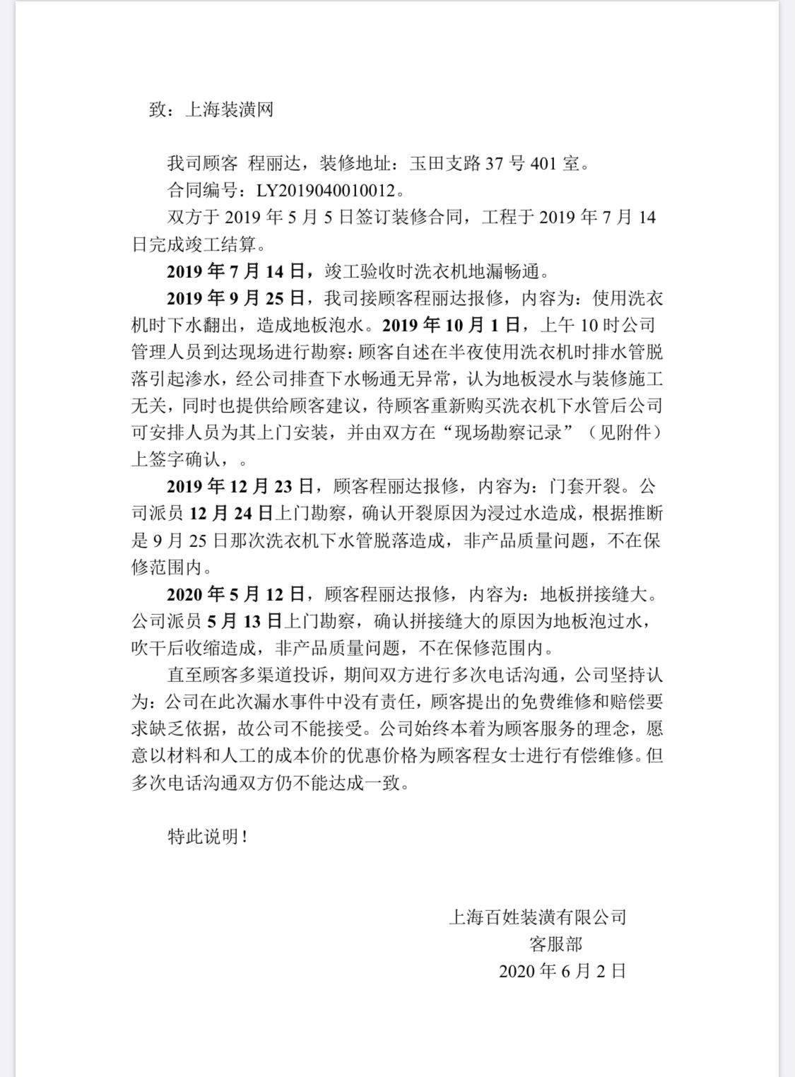 第二次,9月24日晚上啟動洗衣機后,就休息了,第二天一早起床發(fā)現(xiàn),洗衣機地漏又返水了,導致整個房間地板都浸泡在水里(15平方房間,強化復合地板),我又一次致電百姓公司報修,對方派人上門檢查。當初我提出地板浸泡水里可能會損壞的擔心,對方人員表示目前并沒有發(fā)現(xiàn)地板損壞的情況,需要地板出現(xiàn)損壞狀況后,才可派人維修地板。