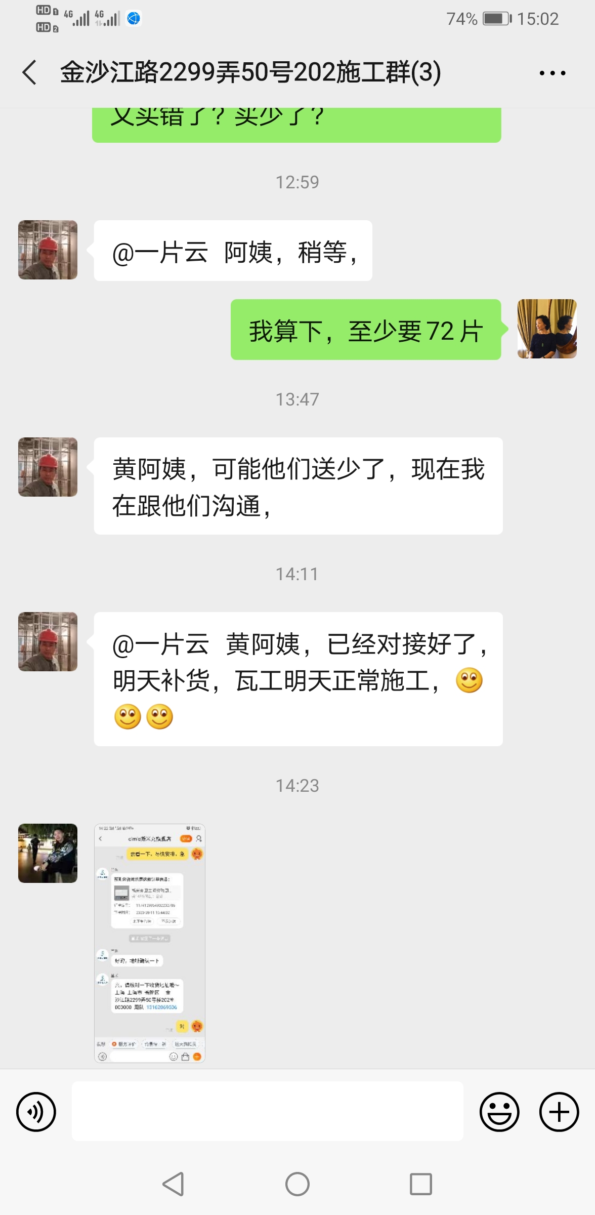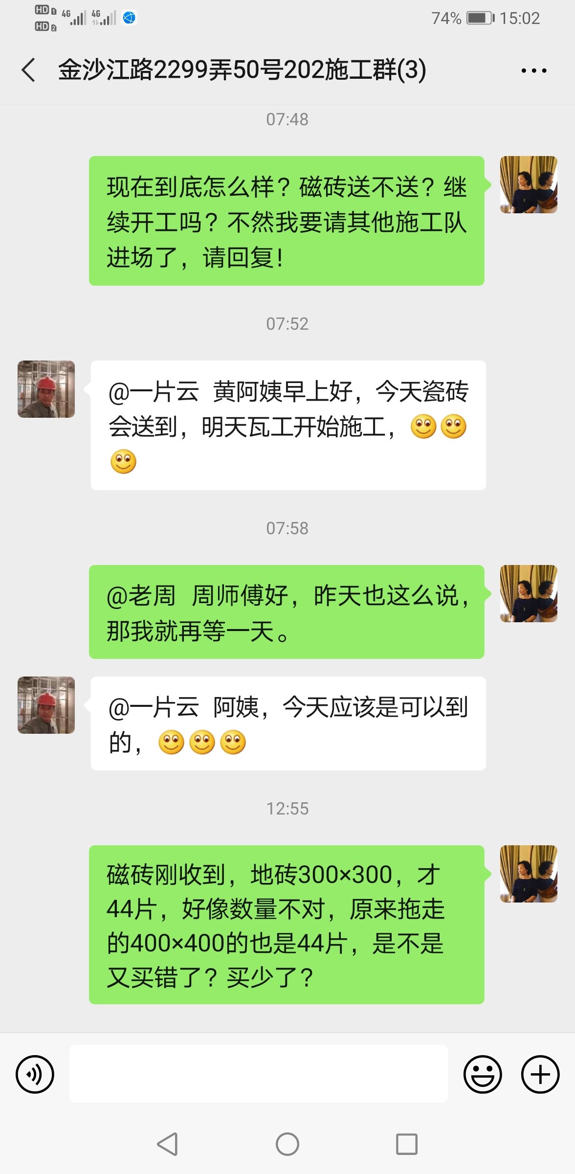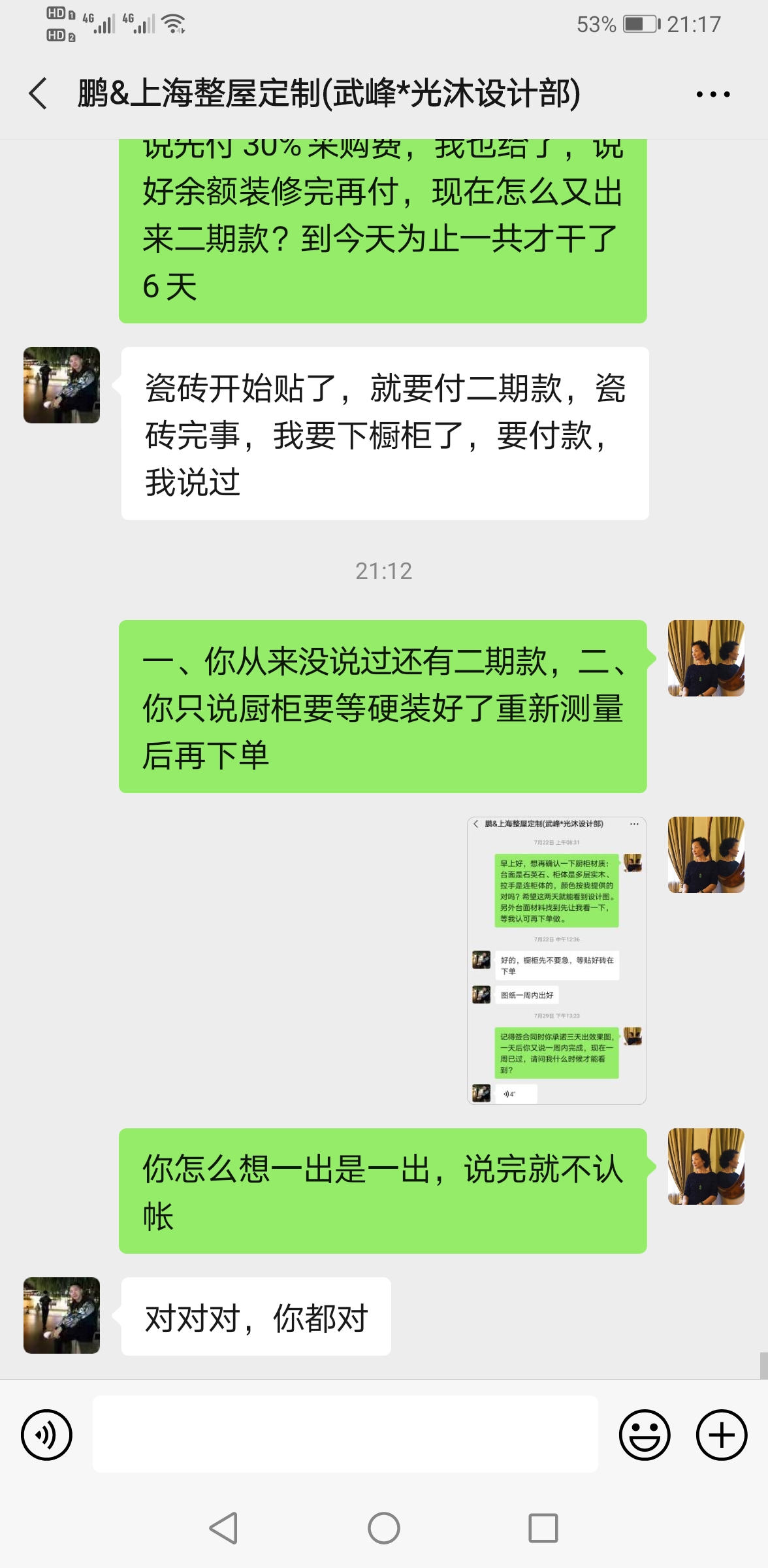瓷磚到貨后,我們發(fā)現問題第一時間和設計師溝通,設計師在電話中大吼發(fā)飆,還說自己去跑采購我們還不領情,可是當初是武峰要求我們預付全款30%一萬多作為材料采購費。設計師在問題出現后,一直逃避承擔問題,各種找理由借口不愿承認自己的錯誤,不愿承擔買錯瓷磚的責任。