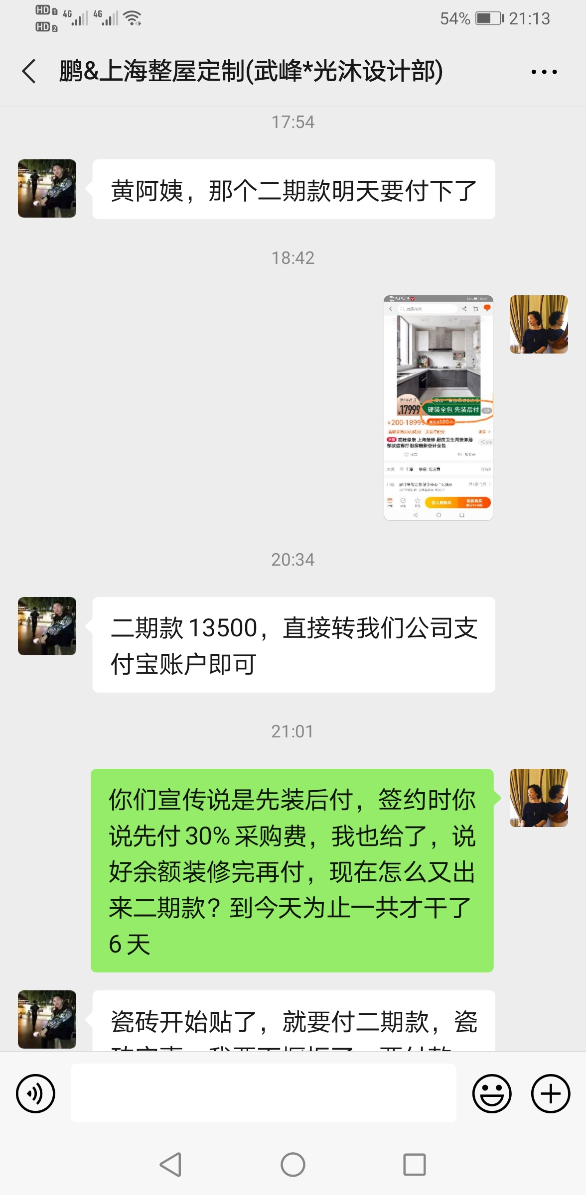 瓷磚沒有到位并且停工的同時,設計師居然問我們要二期的款項,可當初他們的宣傳是“硬裝全包,先裝后付”,當初簽訂合約時,也說30%是材料費,其余尾款裝修完再付。(圖3)