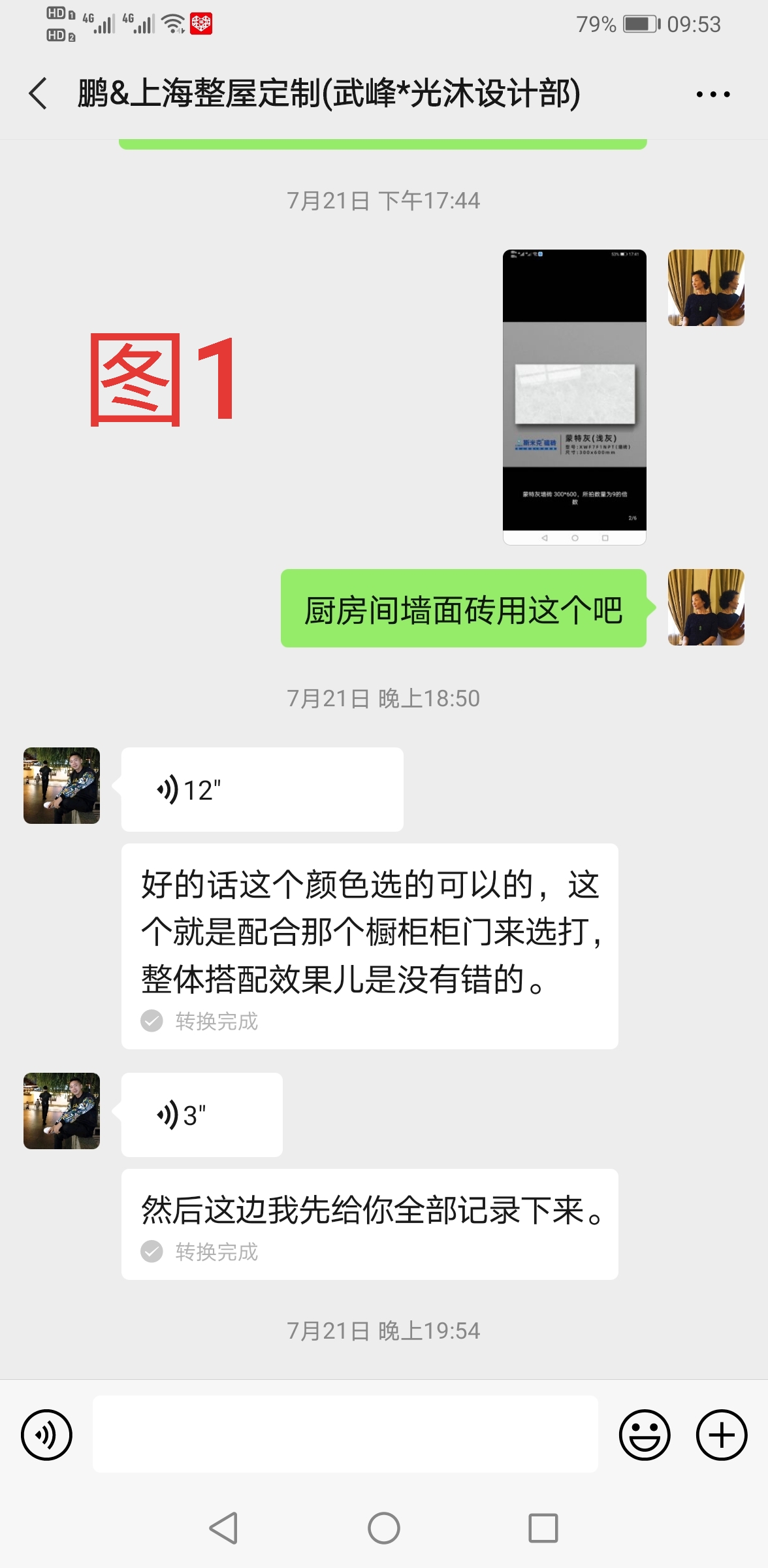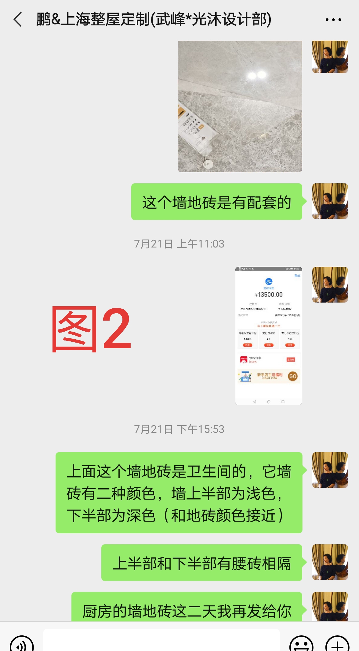 我們只裝修廚房和一個衛(wèi)生間,當初七月簽訂合同時候就說好了瓷磚隨便我們挑選,設計師王鵬還大言不慚說自己公司是上市公司,每個品牌都迫切想要和他們合作,只要市面上有的沒有買不到的。于是簽訂合約,瓷磚的具體品牌顏色,談合約時候都說好了,隨后電話微信也多次溝通,設計師都同意還說都記下了。(圖1)