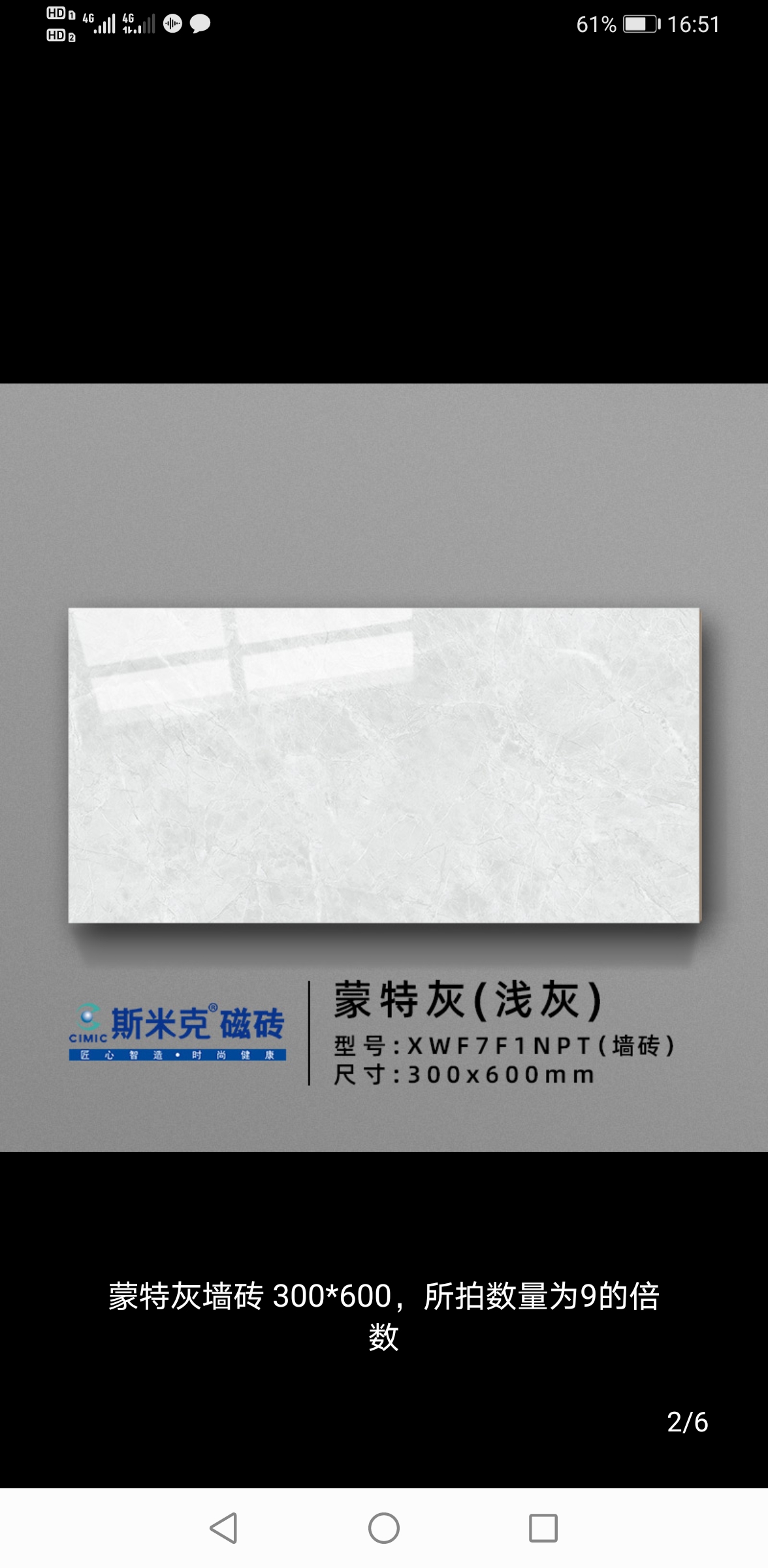 我們的要求是廚房墻磚用斯米克的蒙特灰系列,廚房地磚和衛(wèi)生間墻地磚用能強的一個灰色瓷磚,并提供我們實地查看時當場拍的貨品樣圖和型號。(圖2)