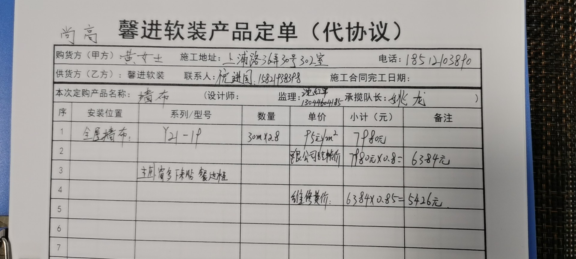 2019年12月,選完墻布測(cè)量完尺寸后,收到墻布商家的報(bào)價(jià)單,墻布費(fèi)用5,426元加500元底膠費(fèi),一共5,926元。裝修公司表示只愿意承擔(dān)2000元費(fèi)用,其余費(fèi)用需我自己承擔(dān)。我要求尚高公司承擔(dān)所有墻布費(fèi)用,但公司態(tài)度強(qiáng)硬,協(xié)商無果。
