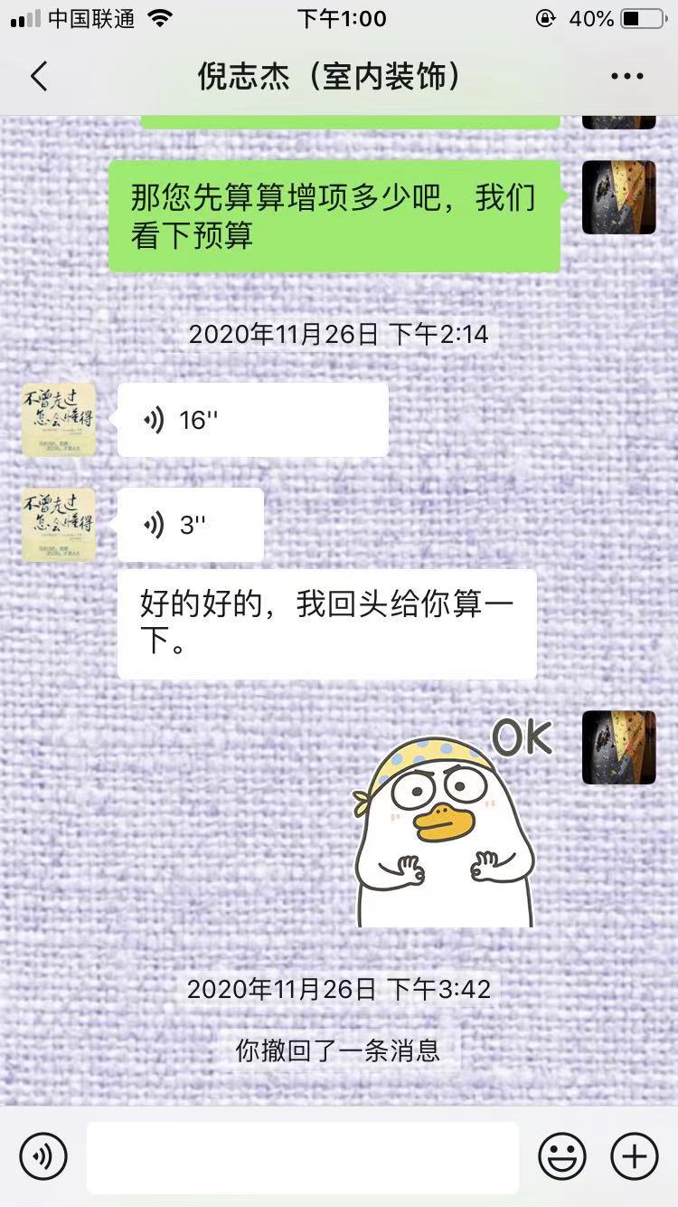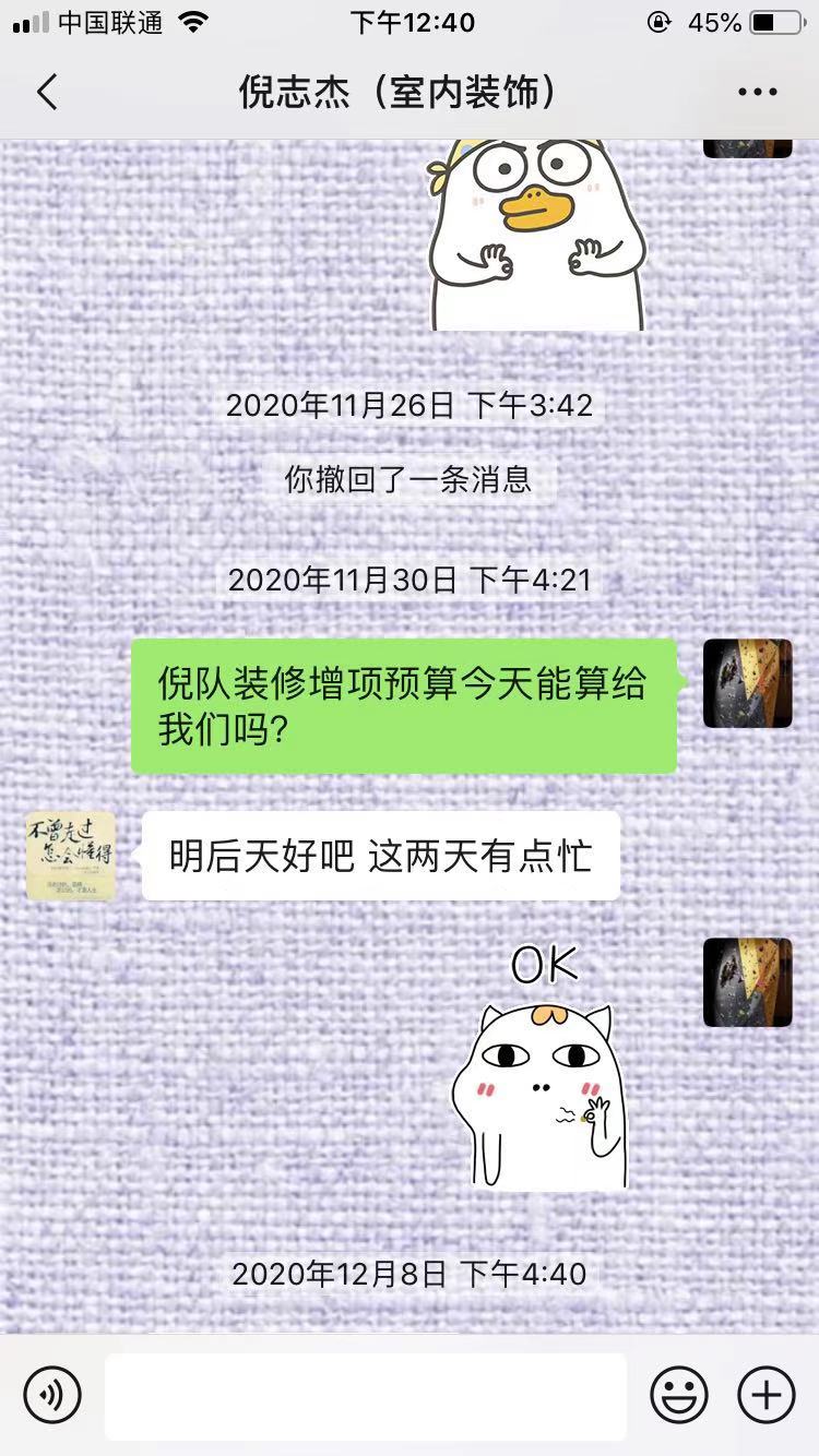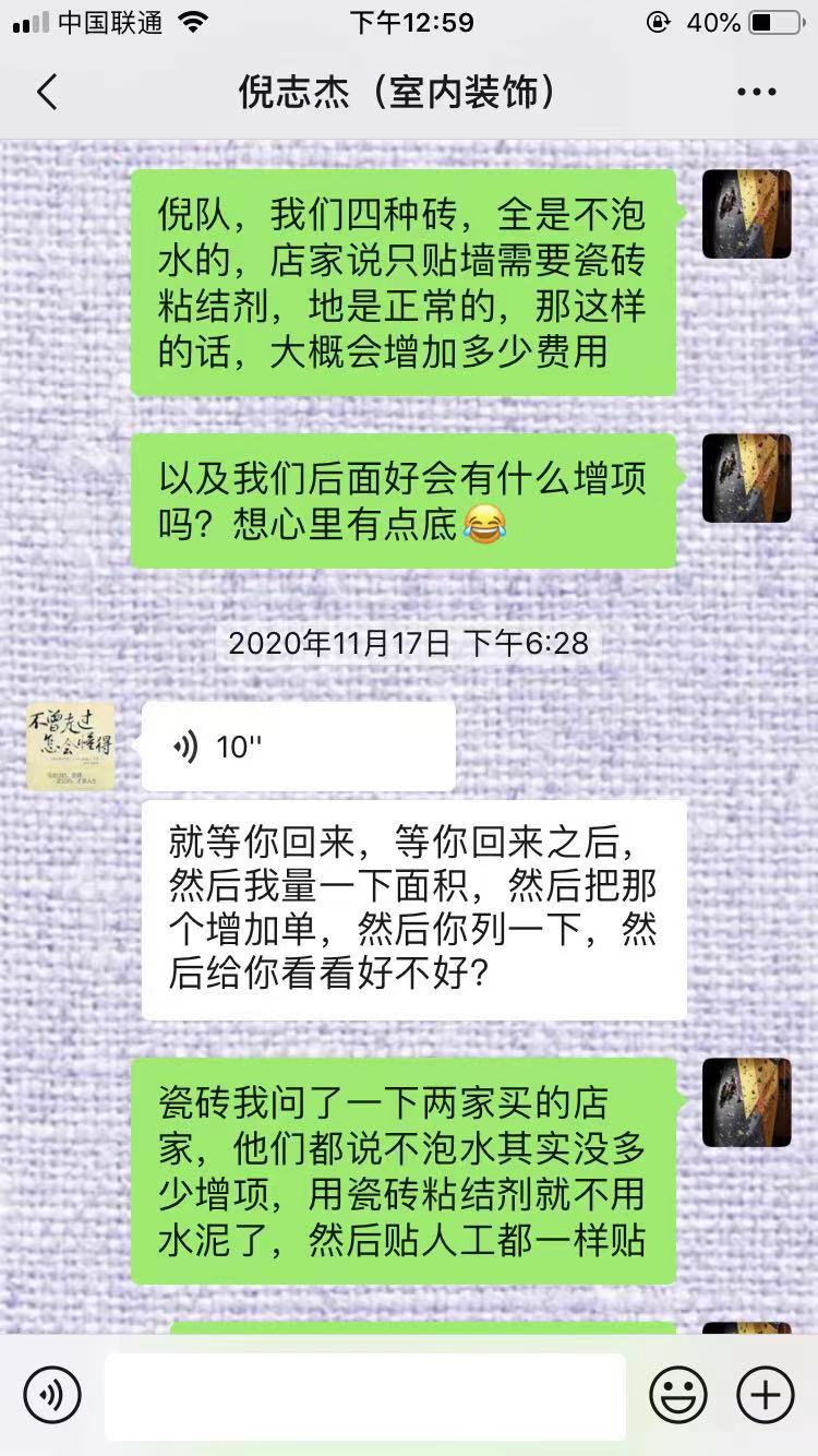 我們?cè)诟肚宓诙P增項(xiàng)后已感到疑惑,故咨詢了第三方監(jiān)理并仔細(xì)查看合同,才知乙方行為并不符合合同規(guī)定和行業(yè)規(guī)范。所以在后期貼磚等事項(xiàng)有變動(dòng)后,我們主動(dòng)多次向施工隊(duì)長(zhǎng)(項(xiàng)目經(jīng)理)咨詢?cè)鲰?xiàng)費(fèi)用,索要項(xiàng)目變更清單,但隊(duì)長(zhǎng)總是以忙、沒(méi)時(shí)間為由一再推脫,