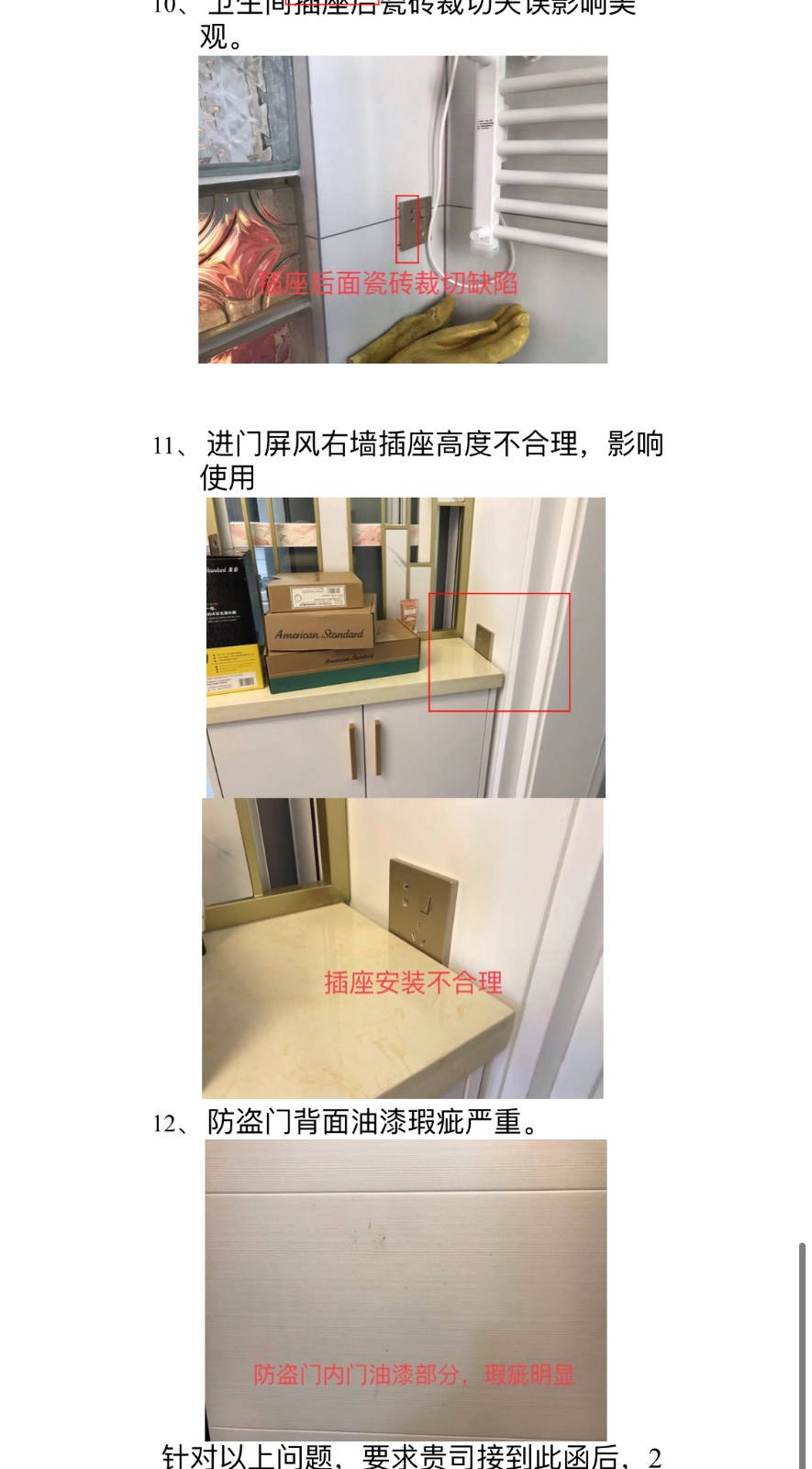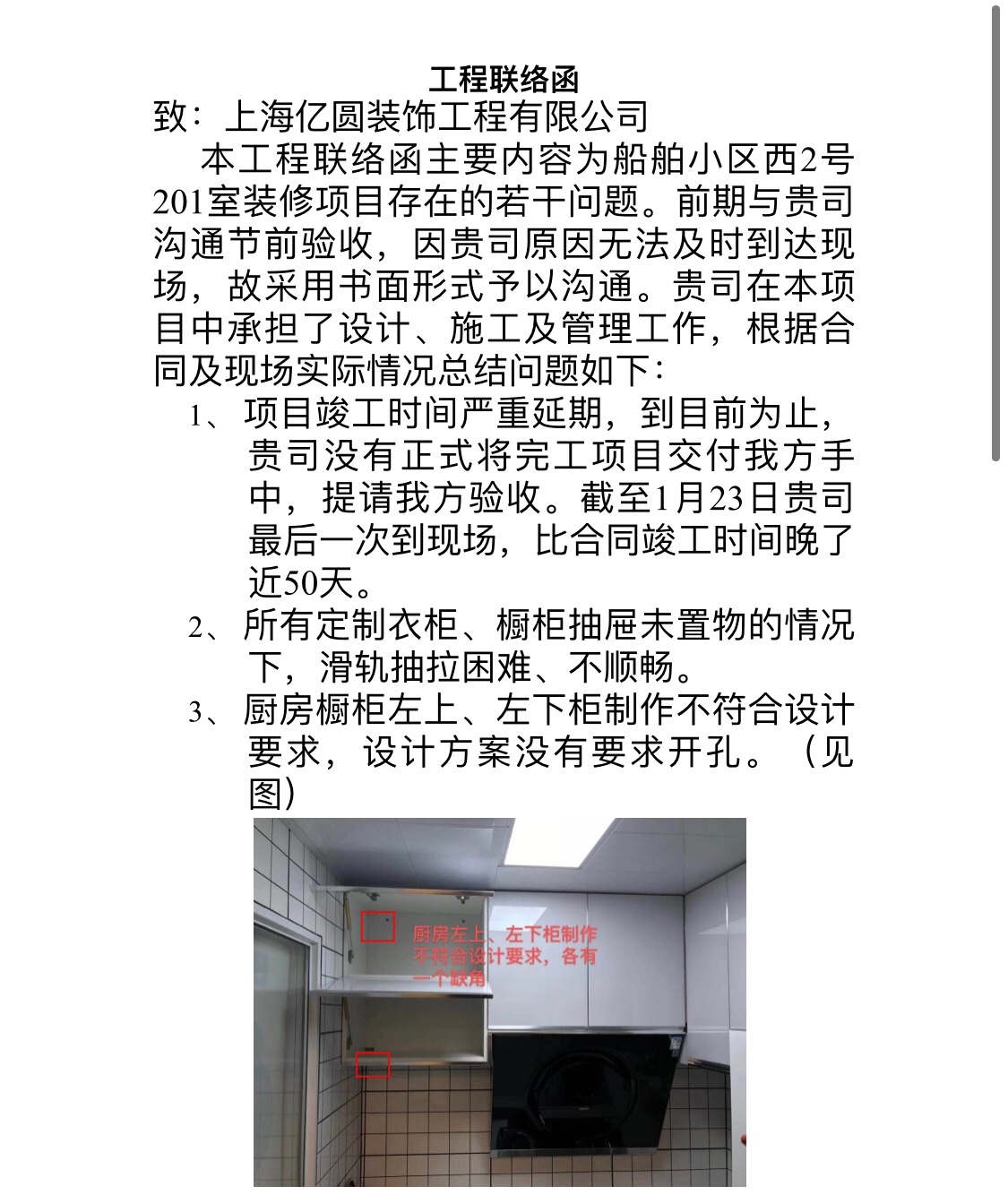 在此提出要求,要求上海億圓裝飾工程有限公司限期一周內(nèi)解決房屋內(nèi)所有因施工失誤造成的問(wèn)題,且該公司未按合同約定工期完成交付,已對(duì)業(yè)主產(chǎn)生了實(shí)際損失,業(yè)主拒絕拒絕支付合同最后驗(yàn)收款。如該公司未在限期內(nèi)解決所有問(wèn)題,業(yè)主將通過(guò)法律手段繼續(xù)追討因此次問(wèn)題造成的所有損失。