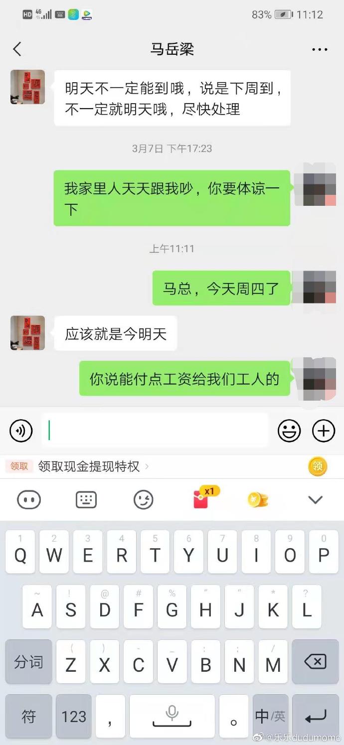 昨天再次聯(lián)系@馬銀華@上海顯尚裝飾催問款項(xiàng),允諾今天轉(zhuǎn)款,可截止到目前13:51分,一分未收到?。?!類似這樣允諾明天、后天、下周的情況已經(jīng)太多太多了!爐火純青的語(yǔ)言藝術(shù),呵呵!再說一次,敬請(qǐng)上海顯尚裝飾設(shè)計(jì)的老板@馬銀華,盡快把拖欠的41萬(wàn)款給付?。?!農(nóng)民工的工資和材料款您肆意揮霍,請(qǐng)你想想給孩子造成了什么榜樣!#上海##上海裝修#?#上海設(shè)計(jì)師#?#海門#?@上海勞動(dòng)仲裁?@上海裝飾協(xié)會(huì)也請(qǐng)與之合作的幾位老板看看他的面目@吳傳雷@顧金耀@施帥華!更提醒一下作為妻子的@郁小燁,起碼督促自己先生,做個(gè)堂堂正正的生意人,而不是靠坑蒙拐騙致富!請(qǐng)盡快把拖欠款給付!收起全文