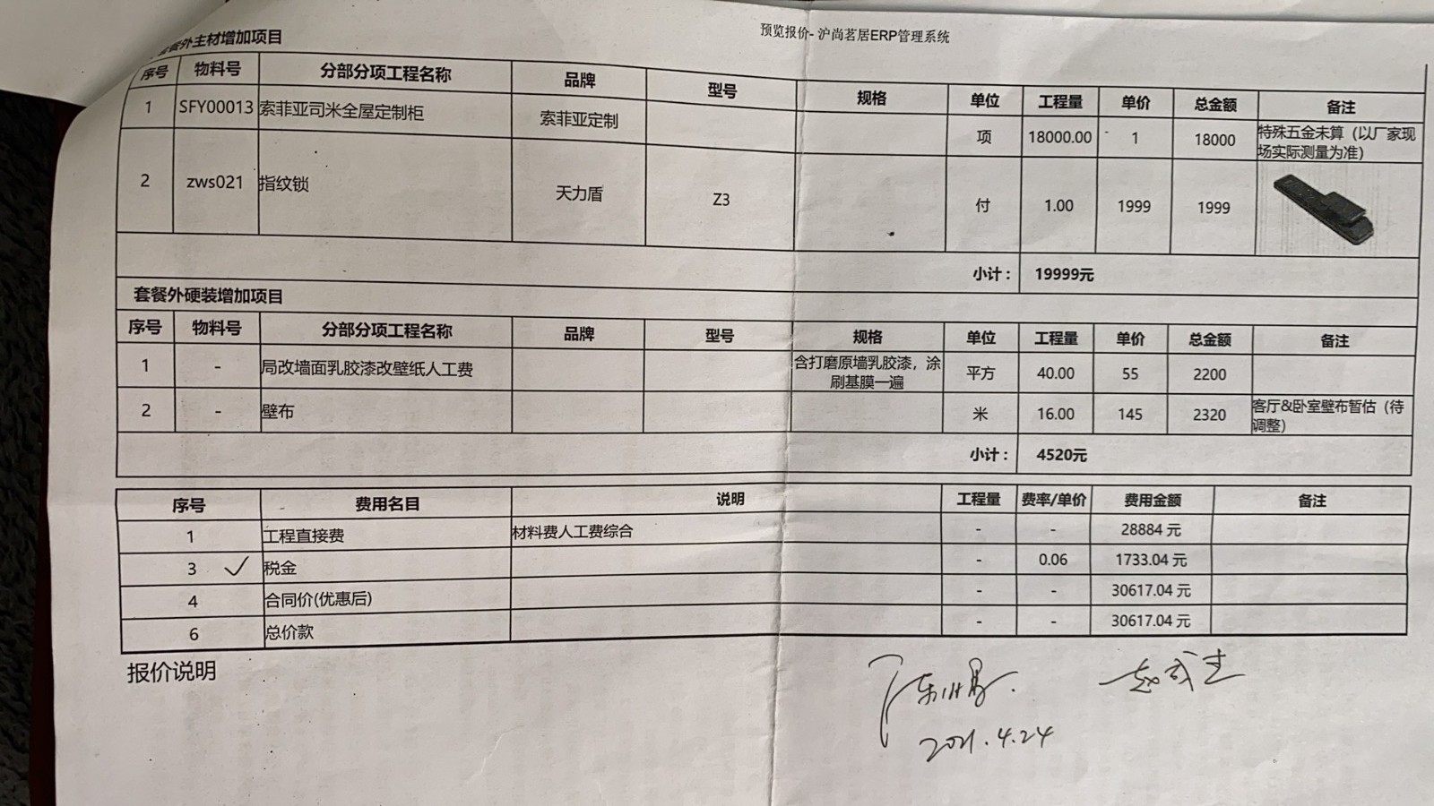 2、報價單中有一條要求,要繳納全部款項的 6%作為稅金,當(dāng)時一共繳納了 1733.04 元要求這部分全額退還。比如我條款中,購買了門鎖 1999 元,也要繳納 6%的稅,本身門鎖就是廠家銷售的,都是稅后價格了,滬尚茗居重復(fù)收取。又如當(dāng)時收取了 1125 元清潔費稅金也按照 6%收取,針對這一部分的問題,可以參見定金合同,合同中明確指出,收稅范圍為床、衣柜等家具,并未規(guī)定對保潔費、門鎖、浴霸等產(chǎn)品再次收取稅金