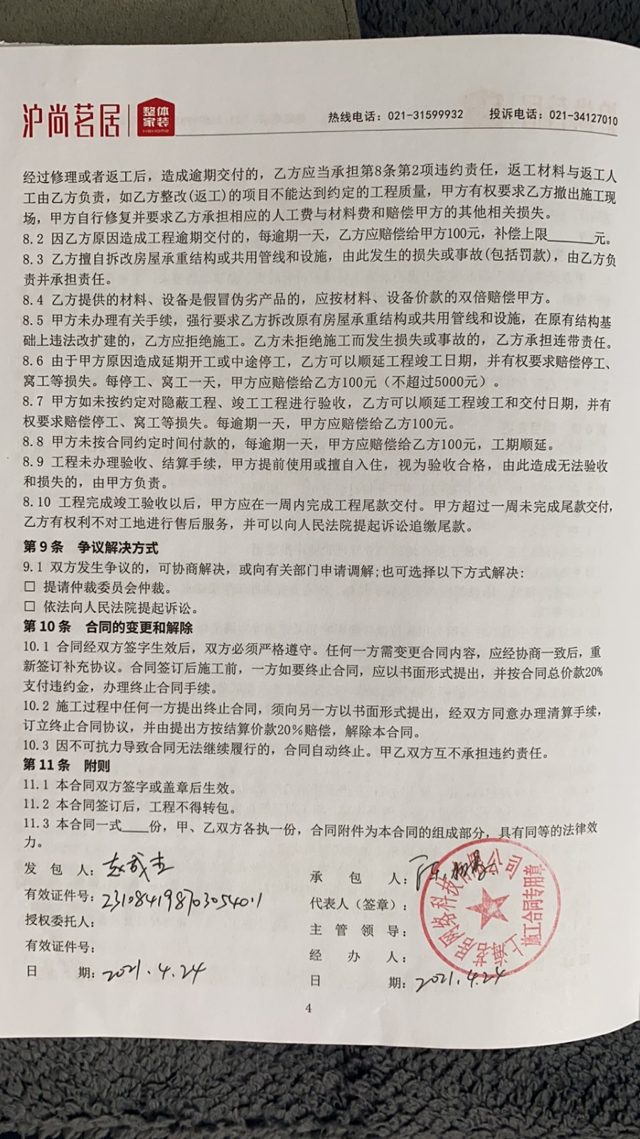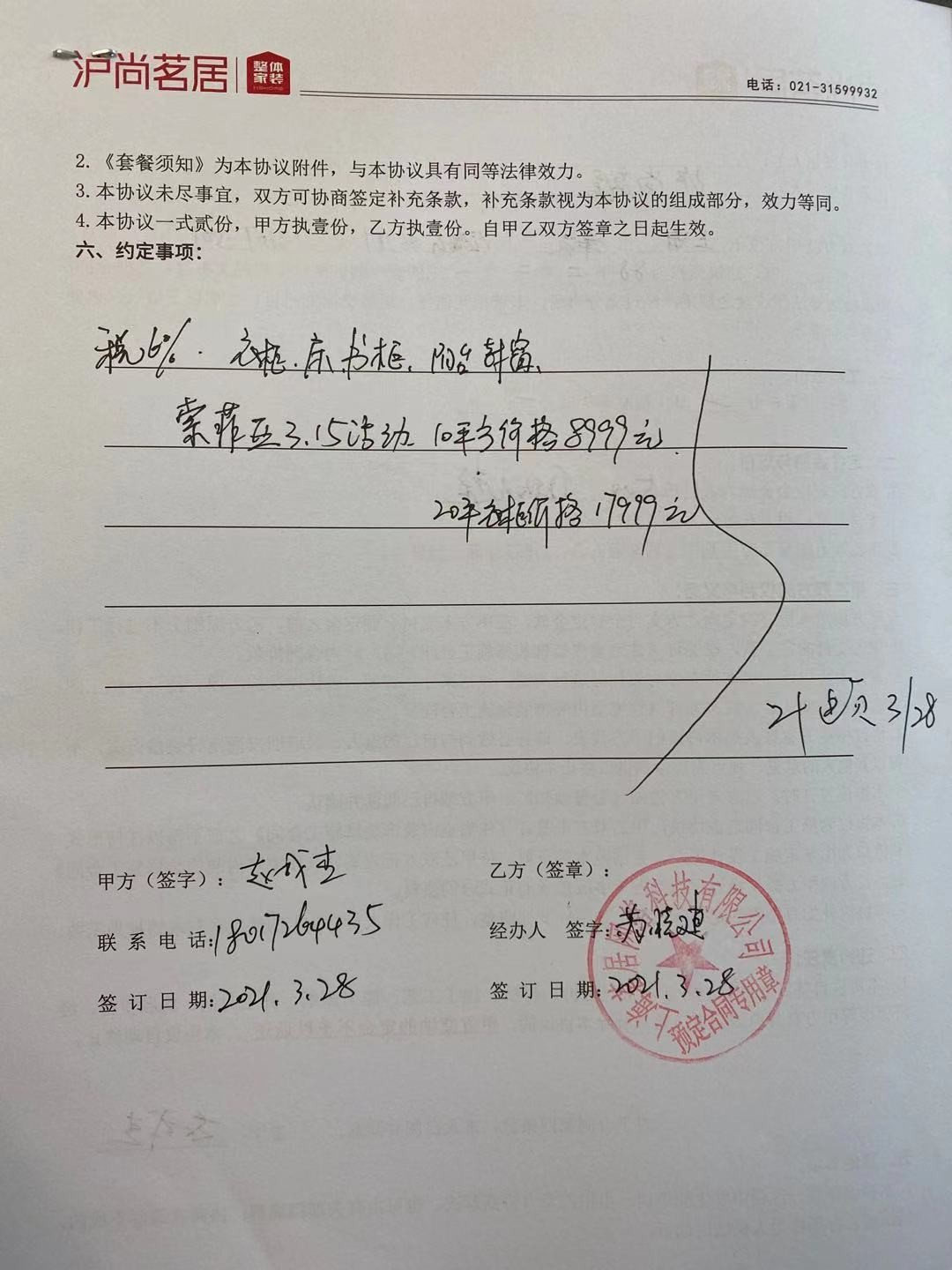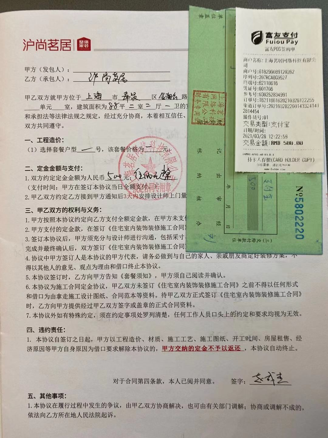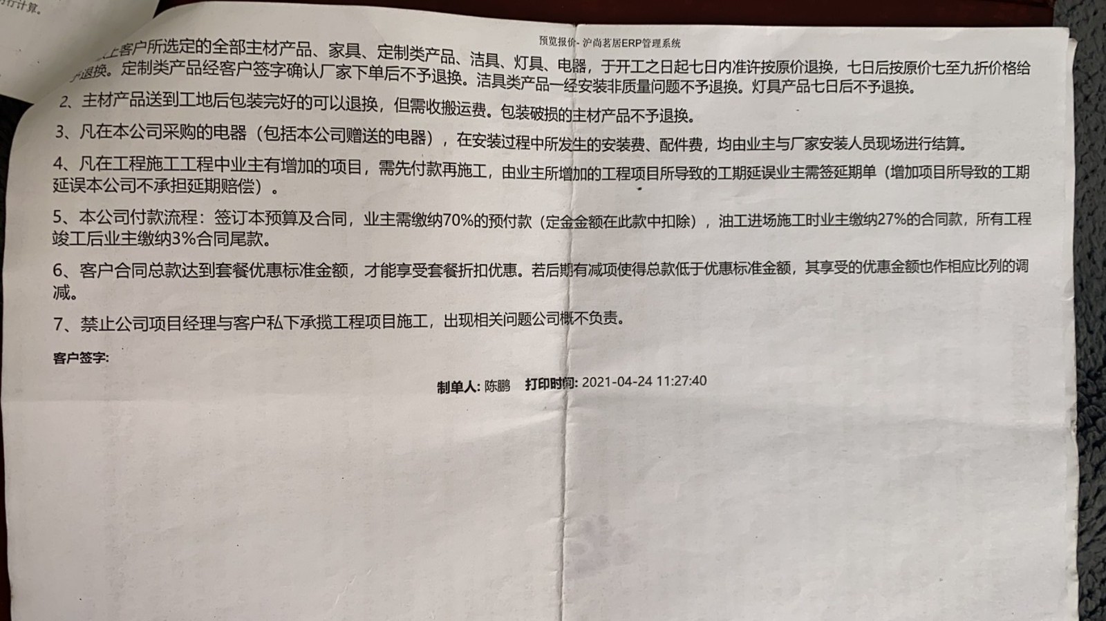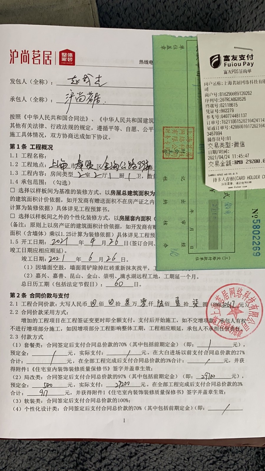 1、2021 年 4 月 24 日,與滬尚茗居簽訂局改協(xié)議,按合同,預(yù)付款繳納了 97%,嚴(yán)重違反《中華人民共和國合同法》預(yù)付款比例不得高于 75%的規(guī)定,按照補充條款,只需繳納 70%,因本人裝修不涉及油漆等業(yè)務(wù),全部為軟裝,故而滬尚茗居在收取這部分費用時均按 97%收取,消費者權(quán)益得不到有效保障,一旦發(fā)生問題,難以追回