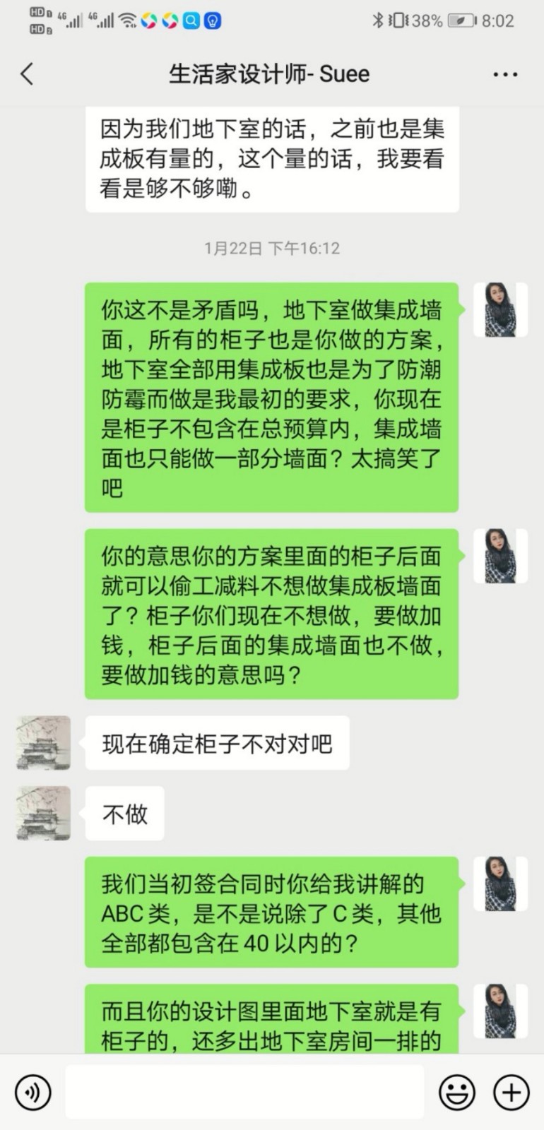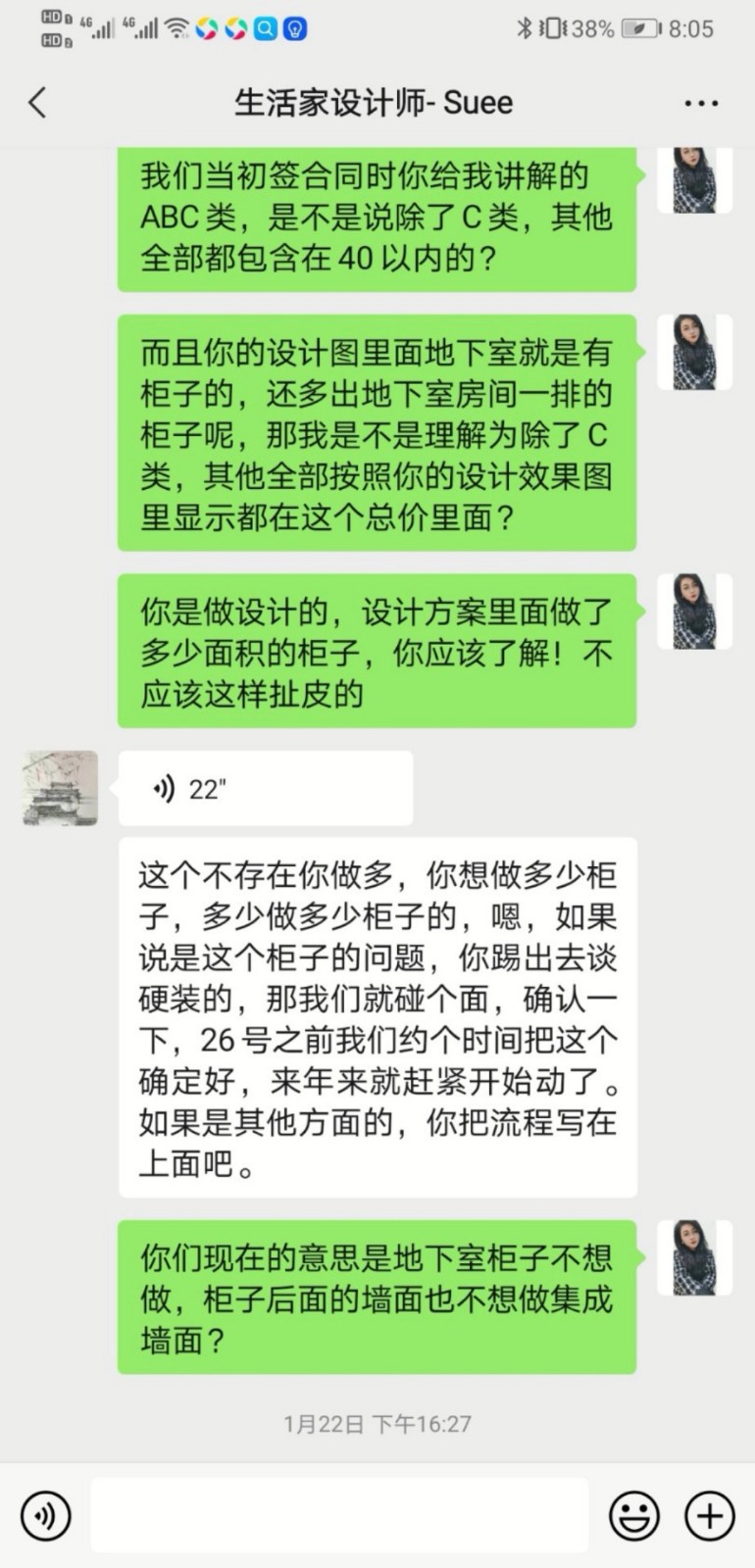 2021年6月26號(hào)我和我老婆到蘇州生活家裝飾,本著詳細(xì)了解一下,因?yàn)樗麄兊脑O(shè)計(jì)師王靜,在電話里和我說幫她沖業(yè)績(jī),她設(shè)計(jì)費(fèi)不要,這單獎(jiǎng)金也貼進(jìn)去,要完成公司安排的業(yè)績(jī),我多次和她確認(rèn)價(jià)格她說沒有問題,我一直是預(yù)算13.5萬(包含定制柜),全部做好,我買家具家電就可以了,她說已經(jīng)和我預(yù)算差不多了,保證滿意。出于對(duì)她的信任,我就帶著老婆從上海去了蘇州