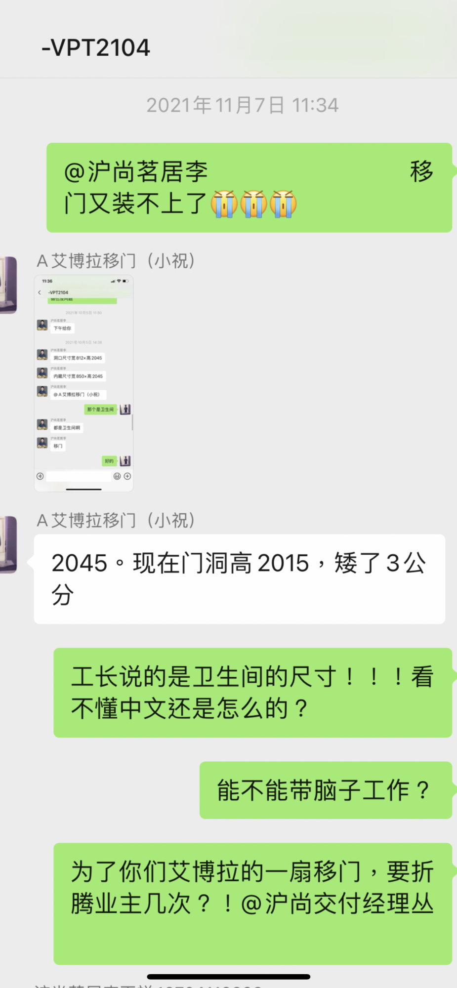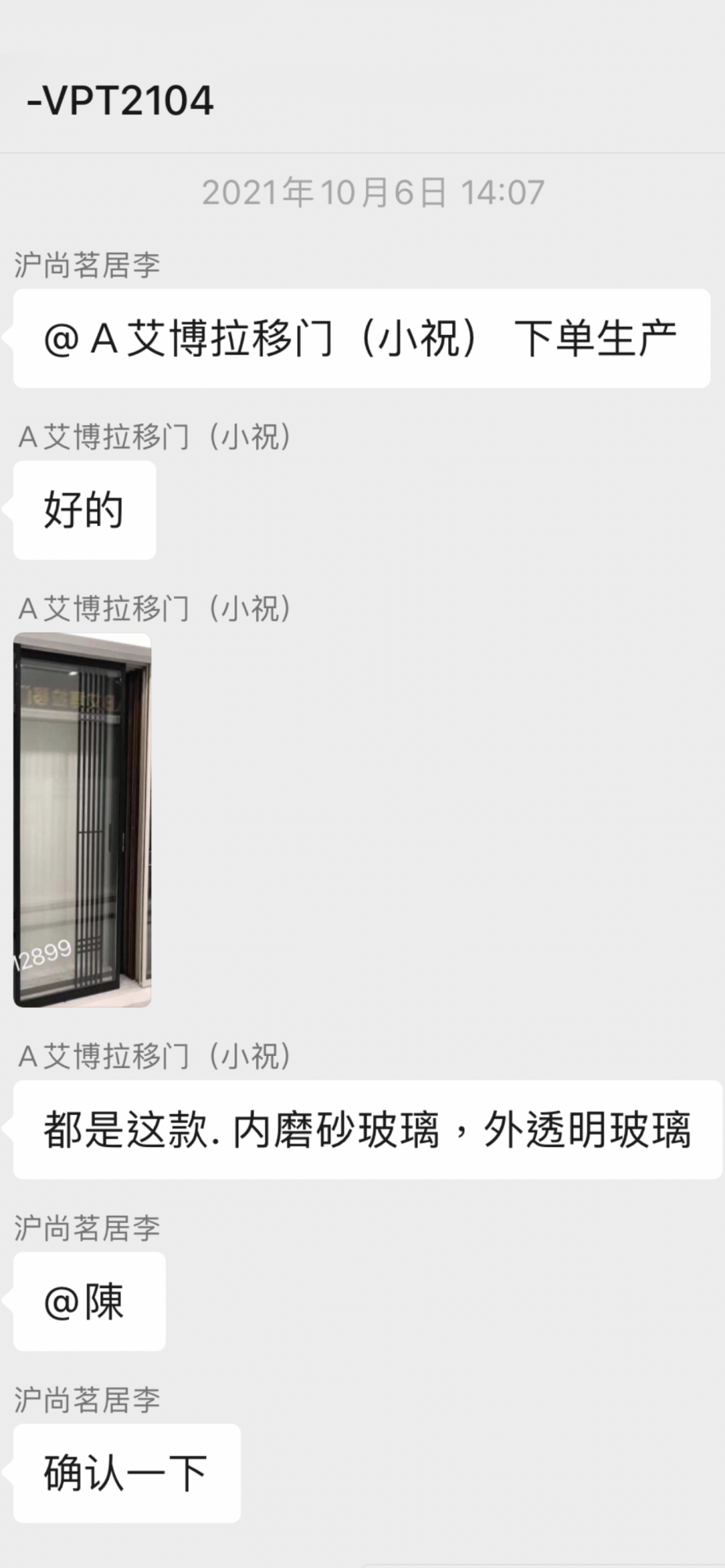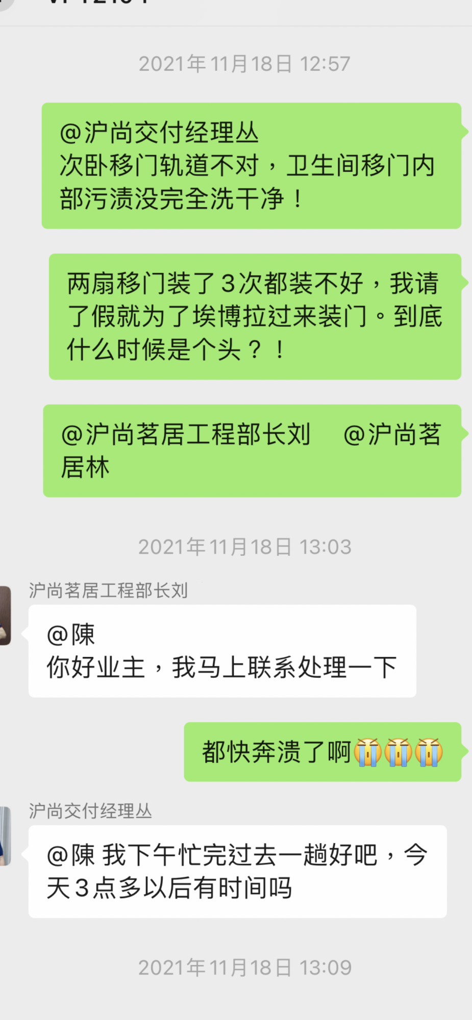 2扇移門被拉回. 并且在隨后2天, 廠家更是威脅說, 不給他們簽延期單, 拒不重新生產(chǎn).后經(jīng)普陀店工程部長出面, 才再次進入生產(chǎn)流程.