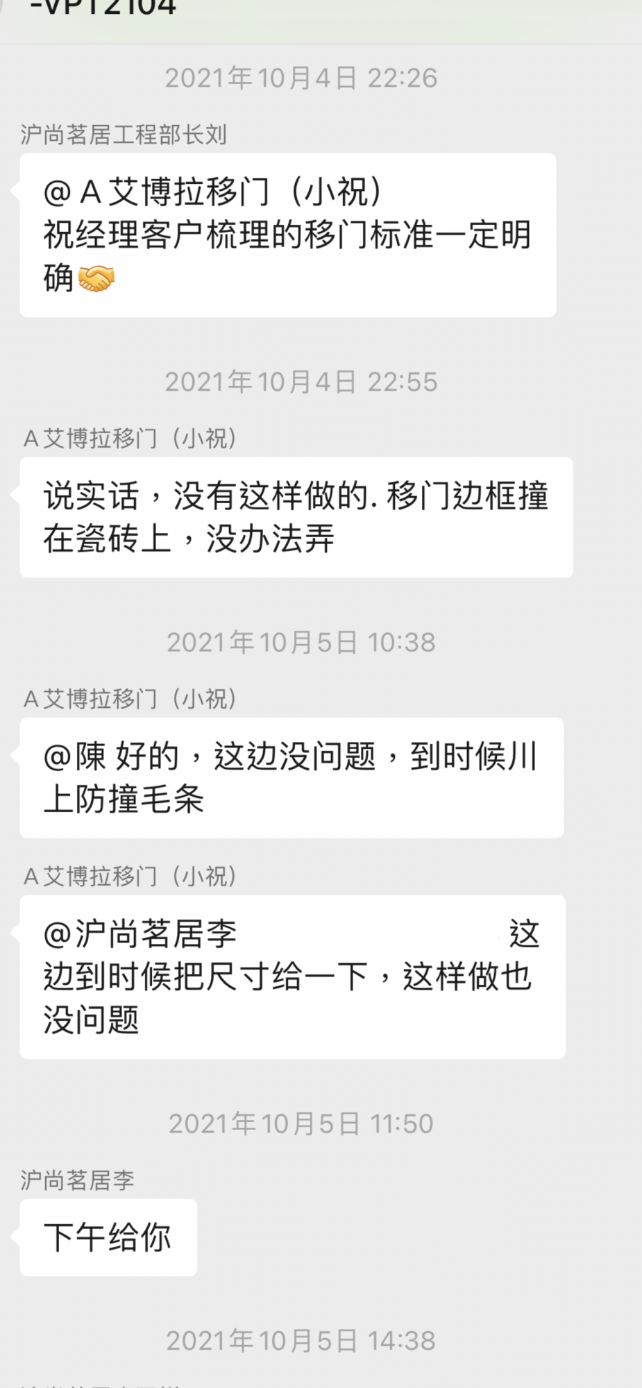 2. 10/05 下午2點半左右, 工長現(xiàn)場測量后群內(nèi)提供尺寸.斷斷續(xù)續(xù)確認到晚上 8點半, 廠家無后續(xù)回復.