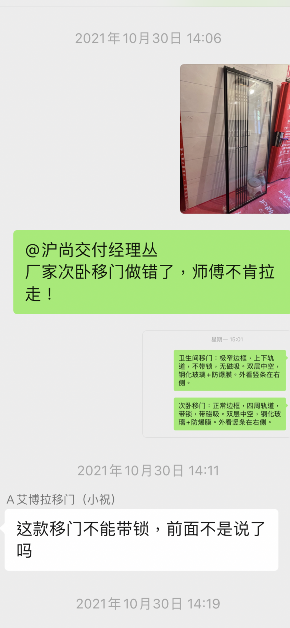 最終: 衛(wèi)生間移門安裝上, 次臥錯誤移門被拉回. 安裝師傅走后, 我們發(fā)現(xiàn)中空玻璃內(nèi)存在污漬. 質(zhì)檢隨后趕來現(xiàn)場, 相關(guān)照片發(fā)至群內(nèi), 但再無下文.