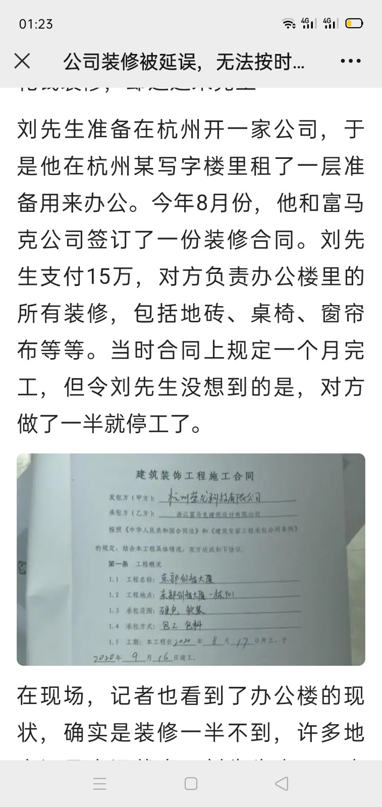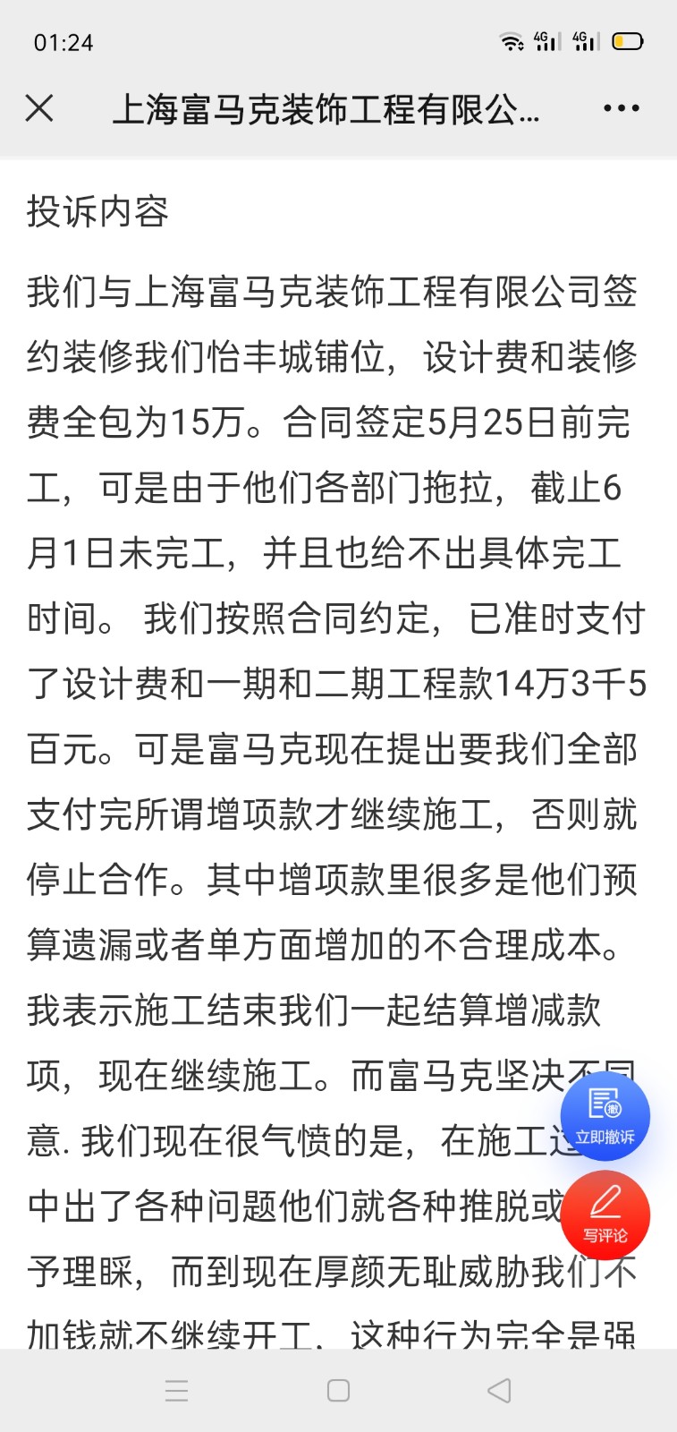 我的店鋪裝修,在支付了富馬克裝修公司第一筆款141000元后,該公司讓他們的包工負(fù)責(zé)人墊資做這個(gè)工程,實(shí)際工程量到了節(jié)點(diǎn)一半時(shí),其包工人沒錢墊付了,讓富馬克公司打款給他,富馬克公司不給他工程款。但是給我繼續(xù)要錢,我提出質(zhì)疑后,富馬克公司竟然直接停工走人。給我停工達(dá)兩個(gè)月多,期間我不斷找他們溝通,就是玩失蹤,不解決不處理。我已經(jīng)造成了巨大損失,開不了業(yè)。無奈之下,我讓律師發(fā)了律師函和合同終止函給富馬克,又請法律公證處到我店里去做了財(cái)產(chǎn)保全工作。全部做完了手續(xù),我才請了別人繼續(xù)來做我的工程。結(jié)果,富馬克公司到我店里現(xiàn)場打罵工人,拉電拉閘,搶走保險(xiǎn)絲。我們報(bào)警,出警五次都沒用,警察對他們有傾向性,不按照治安法規(guī)條例處理和制止他們的涉黑行為。所以富馬克公司更加猖狂,把拉電拉閘作為每天的常態(tài)化,進(jìn)店里行兇。無奈我只能店什么不能做,關(guān)門。