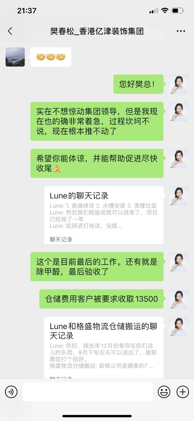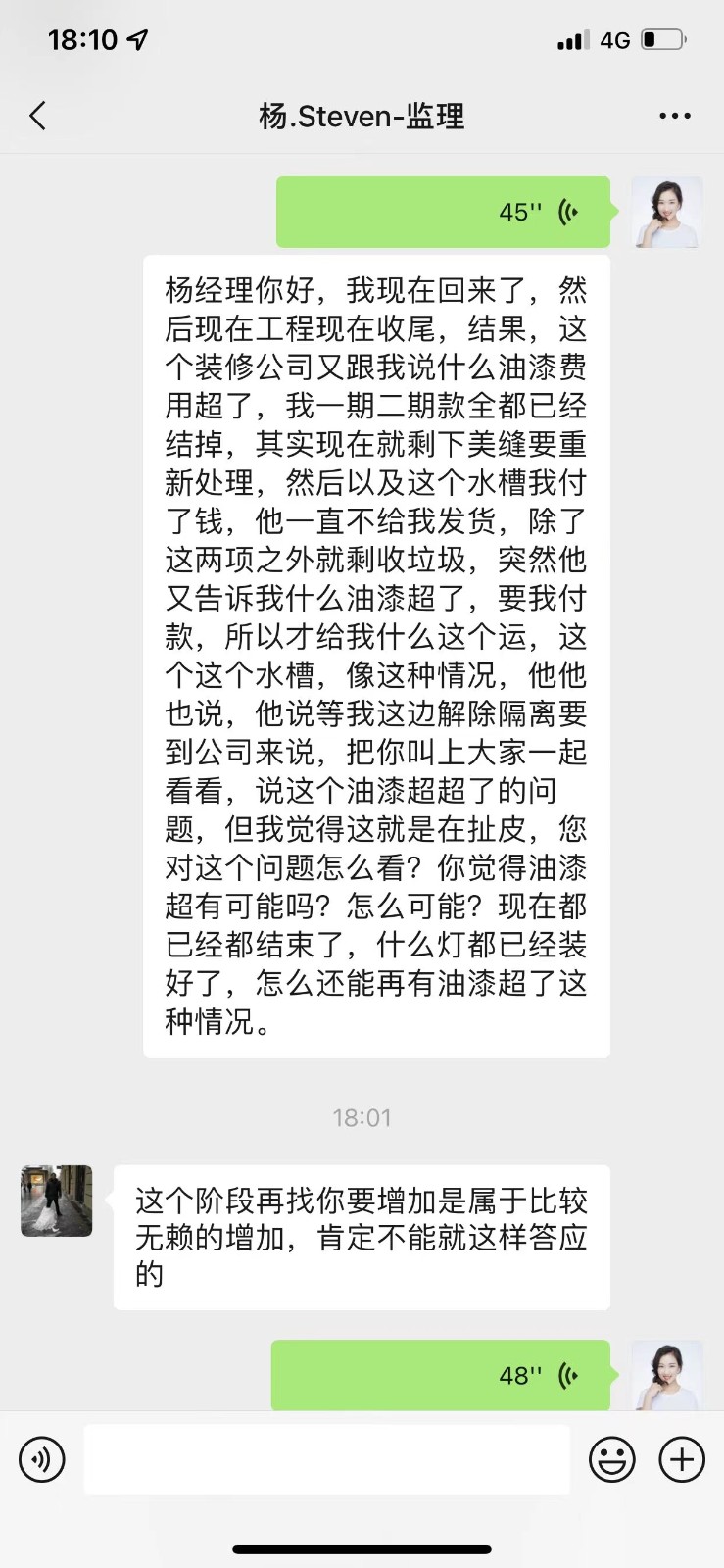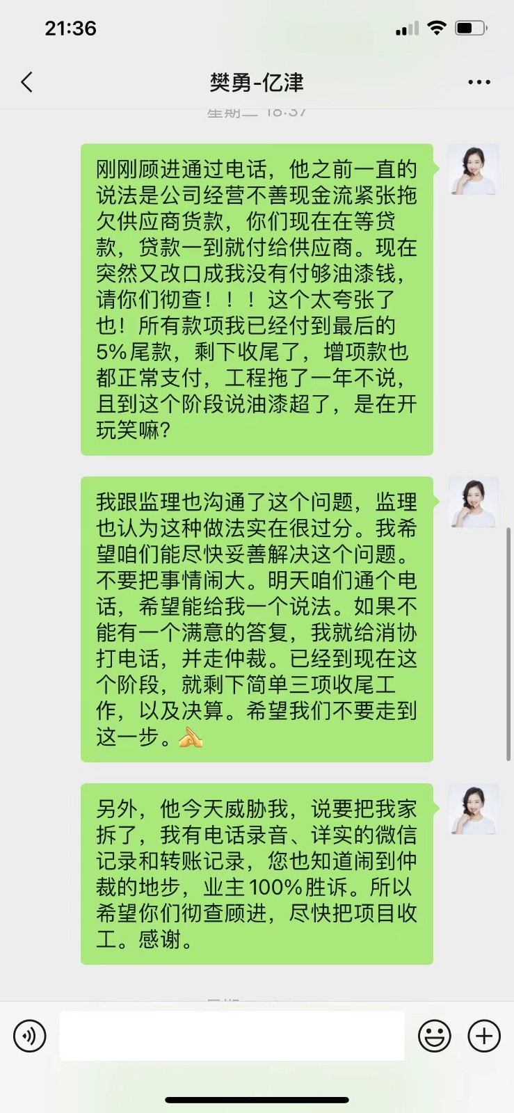 本人位于浦東新區(qū)蘭嵩路555弄D1101的房子(房產(chǎn)證面積173平米)于2021年7月開工,原計劃完工驗收時期為2021年11月底,然而至今依然未完工。施工過程中,億津裝飾公司不履行合同,亂收增項費用,在業(yè)主提出質(zhì)疑后威脅業(yè)主不付增項就不開工。目前項目已持續(xù)一年零兩個月之久,依然有多項未完工,聯(lián)系不上工程管理人員,公司實際控制人也在了解了情況后再也未接聽電話。目前多方了解到,億津裝飾拖欠工程款、供應商款項繁多,造成供應商與工人罷工,業(yè)主已付物料也被私吞。管理人員威脅業(yè)主:”你信不信我把你家都拆了!"