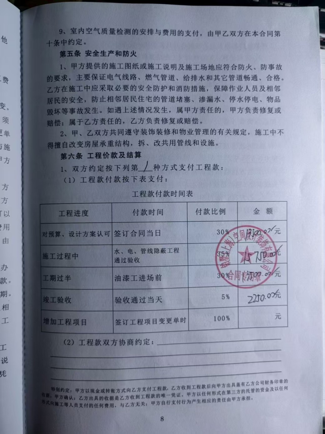 2025年3月23日簽合同時預(yù)付第一次工程款30%;水電管線初步完工就開始催收第二次工程款,2025年6月23日水電管線初步完工業(yè)主又支付第二次工程款35%,當付好第二次工程款以后的第二天,項目經(jīng)理陳素勝就開始索要我們需要收取第一階段水電管線增加的費用6324.60元,開始計算各種增費了,搞得我一頭霧水,不知道什么計算規(guī)則、標準,真正做到斤斤計較、分毫不讓,二根電線管算2根墻槽,三根電線管算3根墻槽。。。。。。電源箱處七根電線管算7根墻槽,依次類推,只要開一條1公分的小槽也按米計算,不知道這個是哪里來的國家標準、行業(yè)計算標準。我家因為是94年多孔磚老房子,非常好開槽,施工寬度嚴重超標,被水電工用榔頭敲成一個一個大窟窿,水泥漿補墻槽墻洞也不潤水,嚴重影響房屋結(jié)構(gòu),我們也不計較。水電工預(yù)留電線故意留長,截下來電工帶回去買廢品,反正都是業(yè)主的錢。