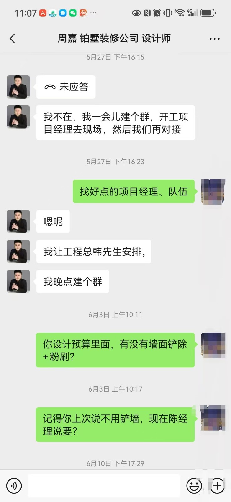 2025年3月23日簽合同前,鉑墅(上海)空間設(shè)計裝飾有限公司設(shè)計師、簽約人周嘉說得天花亂墜,稱全部設(shè)計項目工程量都已包括在預(yù)算報價內(nèi),絕對不會有增加項目、隱形收費,業(yè)主的裝修當自己家里事做。建群開工后,設(shè)計師就開始玩躲貓貓,打電話也接,發(fā)信息也不回,群里@也不理,去辦公室交流設(shè)計方案也沒有人,只見他的頭像還在群里,微信不回,還給我拉黑了。