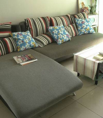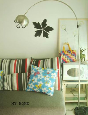 扮家心得:家是點滴積累的,平時多逛逛家居商場,多積累些小飾品比較好,一次性購買往往會時間太緊迫。 L型沙發(fā)加條紋抱枕共1500元,原價2800,樣品再砍價,1500就拿到了,當(dāng)時買得比較急沒有細(xì)選,覺得占面積太大了,但是大有大的好處,橫七豎八都可以躺。