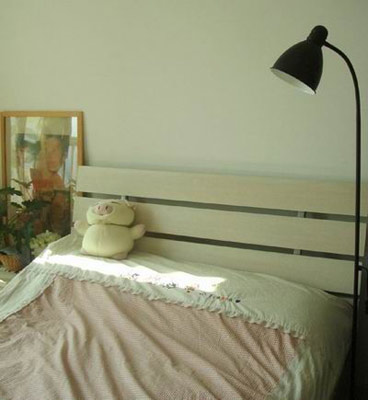 金屬落地?zé)?,在家之福建材市場選的,砍價至135元。 小桌子旁就是一個大落地窗,窗外是陽臺,養(yǎng)了些花,小桌子是宜家的,70元,上面的微波爐是我購物中獎得來的,沒花錢。