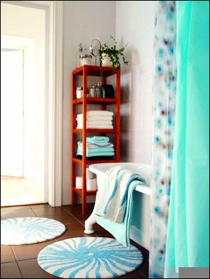 清爽浴室 干凈清爽的白磚本身就能帶給人很整潔干凈的感覺,而冰藍和純白色浴簾更在整潔中點綴了一絲涼爽,木質的擱架也透露出自然的感覺。
