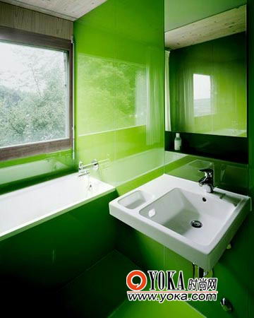墨綠色的櫥柜組合就像一整條香皂,一體化、光滑,沒有多余的把手,整塊臺面頗具現代感,毫不流俗。