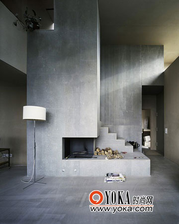 混凝土構筑的獨特樓梯充滿藝術感,一層的平臺給人多種使用選擇