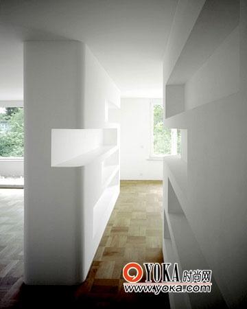 空間過大難免影響利用率,分隔它的時候不用太強硬,兩排圓滑又一體的半墻體似墻又是擱架。簡單最好。