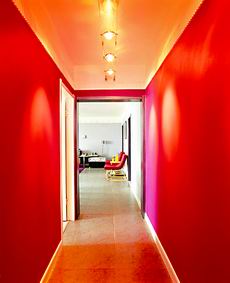 大膽地應(yīng)用了亮紅色,一進(jìn)門就可以感覺到濃濃的暖意,但設(shè)計師建議在走廊的兩邊懸掛主人的一些有回憶的照片,增加一下情調(diào)。