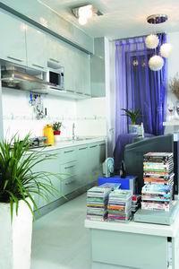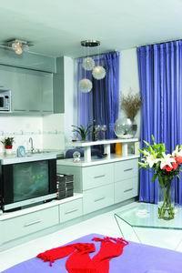 真正進(jìn)了屋,一定要驚訝她的客廳居然一半是廚房。她的家中你找不到廚房,客廳就是廚房。電視機(jī)和長(zhǎng)形吧臺(tái)為界,將廚房與客廳隔開(kāi)?;疑奈魇綑还裾紳M客廳的一面墻,鍋碗瓢盆樣樣齊備。詹曦自豪地介紹,客廳原本很小,進(jìn)門(mén)的儲(chǔ)物間與廚房并列,她就將儲(chǔ)物間拆了,把廚房納入客廳,這樣廚房與廳連為一體,既是客廳又有廚房,寬敞明亮,本想更大膽地將客廳墻也拆了,將臥室也納入進(jìn)來(lái),可惜工人說(shuō)客廳的墻是承重墻不能打,只好做罷。