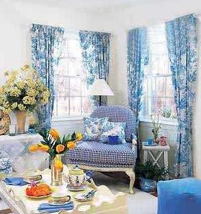 淡藍(lán)風(fēng)格的小碎花布藝加上自然材質(zhì)的裝飾再加上印有淡藍(lán)花色的茶杯。 家居里彌漫著優(yōu)雅的鄉(xiāng)村田園風(fēng)格。淡淡藍(lán)白碎格子沙發(fā)透著鄉(xiāng)村風(fēng)格的樸素,田園風(fēng)格的木質(zhì)茶幾,窗簾上那些淡藍(lán)色的碎花紋猶如手工描繪般細(xì)致。