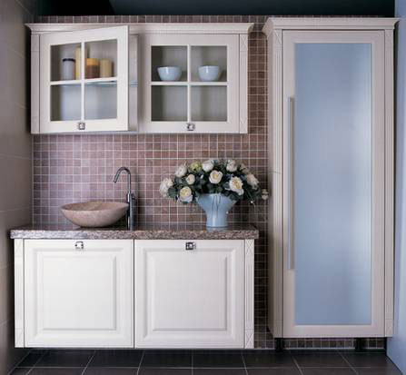 將往昔的魅力與現(xiàn)代生活結(jié)合在一起,永遠(yuǎn)是設(shè)計(jì)師創(chuàng)新的源泉。浴室家具門板上的刀切紋路,小巧古典的柜門把手,這些細(xì)節(jié)跟過去在舊電影中看到的一樣,呈現(xiàn)著一股凝固住時(shí)間的懷舊氣息。只有注重整體細(xì)節(jié),才會(huì)有完美無暇的整體效果。整面主題墻,無論色調(diào)、造型與飾物的擺放,都顯得輕松而舒適,每日一小時(shí)的衛(wèi)浴時(shí)光成為鄉(xiāng)野中的小憩,帶著懶洋洋的悠閑氣質(zhì)。