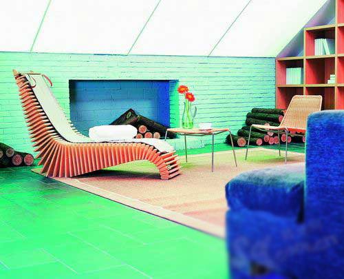 青磚壁爐的味道得以充分展現(xiàn),在顏色上呼應(yīng)了地板與沙發(fā),排骨架臥榻上鋪上棉墊就具有了柔軟的觸感,它的前衛(wèi)脫俗讓會客的感覺更加親密,在色彩上也和土黃印花的大幅地毯相呼應(yīng),加上瑩藍色的布藝長沙發(fā),帶來視覺上的飽和度。
