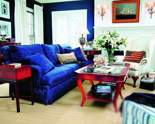 如果你家的客廳具備古典歐式的設(shè)計元素,可以選擇藍白分明的沙發(fā)和墻面裝飾,利用視覺上的通透感,讓客廳顯現(xiàn)出一種明朗的寒季味道。白色靠背椅與考究木色的茶幾、邊幾增添無限暖意。
