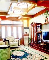 此客廳的電視背景墻采用櫸木板裝飾,莊重典雅,與配飾的家具極其協(xié)調(diào)。