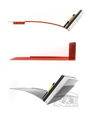 這款書(shū)架的設(shè)計(jì)非常的簡(jiǎn)約,一塊薄薄的鐵板固定在墻上就變成了這樣一款書(shū)架。它的特點(diǎn)在于充分借助了鐵板的韌性,只要像圖中那樣以此挨放在書(shū)架上就會(huì)在重力的作用下將其壓彎,這樣一來(lái)另一側(cè)也無(wú)須增加書(shū)檔卻仍然可以將書(shū)放的穩(wěn)穩(wěn)當(dāng)當(dāng)。
