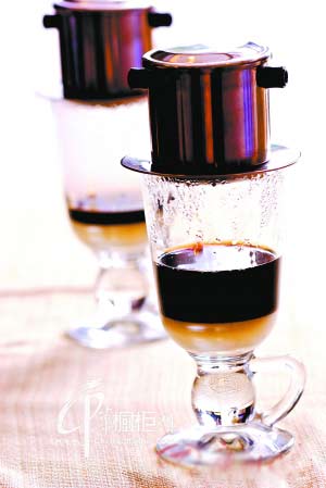 越南的咖啡風(fēng)情很大程度在于其沖泡過程,它不是用咖啡壺煮,而是一種特殊的滴濾咖啡杯,下面用樣式古老的印花玻璃杯接著,就像沙漏在計(jì)時(shí)一樣,一滴一滴都用來消磨曼妙時(shí)光。做的時(shí)候下面的玻璃杯杯口架上滴漏杯,在滴漏里面放咖啡粉,壓上一片有洞孔的金屬片,再用熱水沖泡,讓咖啡滴滴答答的滴到杯子內(nèi)。講究一點(diǎn)的做熱咖啡時(shí)把杯子架在一個(gè)加滿開水的大碗里保溫,因?yàn)榈瓮暌槐Х瓤赡芤檬昼姡瑹峥Х葧龅簟S腥讼矚g在杯子底下加一層很甜很甜的煉乳,等咖啡都滴到杯子里,再把咖啡和白煉乳混合起來喝。如果是黑咖啡,一般不給你吸管,如果是有煉乳的就會給你吸管。只有那些耐得住性子的人,才會等待到一杯咖啡滴完了,再慢慢吞吞地喝下去,領(lǐng)略到慢活的美妙。