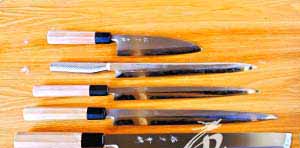 這些刺身刀按外形可分為兩類,一類刀背較厚,有將近半寸,尖頭短身,多用來斬魚頭及起魚肉,可以輕易斬?cái)圄~骨,稱之為出刃庖刀。另一類則稱為柳刃庖刀(又稱萬能刀),刀鋒薄而刀身較長,用以將大塊魚肉切成等份或切片狀的刀,如果按用途分,則可分為去鱗、橫剖、縱剖、切骨等用刀。