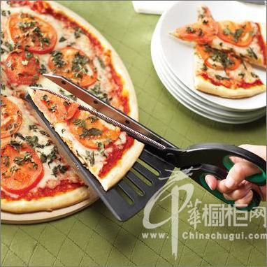 它的切割部分與普通的剪刀類似,可以輕而易舉地將批薩切開。但是這款產品在“剪刀”旁邊還專門配有一把小“鏟子”,因此當你剪下比薩的同時還可以順便用這個小鏟子將剪掉的比薩取出來。