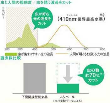 松下 電工(National)新開發(fā)1款不易招蟲的LED 照明燈具,共區(qū)分居家常用的白色和黃色2種類型,因LED可控制光的輸出波長區(qū)段,松下電工在產(chǎn)制過程刻意避開容易招蟲的波長光區(qū)段,透過實驗證明,新燈具的誘蟲指數(shù),可降至僅有傳統(tǒng)水銀熒光燈 的1/3。