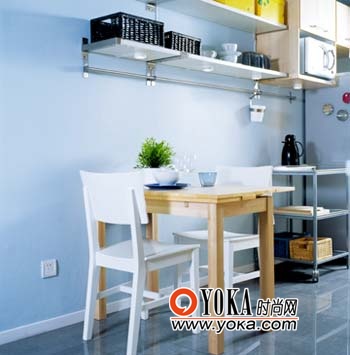 小戶型的類似功能區(qū)應(yīng)盡量合并、重疊,如廚房和餐廳區(qū)域的共用,走餐廳廚房一體化的路線。可延展的餐桌和帶有滑輪的推車都能靈活運用于這樣可變換功能的廚房里。