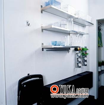 在廚房的適當(dāng)位置裝一些墻面支架,甚至可以把微波爐這種大件轉(zhuǎn)移過去,臺面就不再擁擠了。不過,這類功能性極強的墻面擱板或支架一定要買質(zhì)量好、承重能力強的。另外廚房內(nèi)的擱架和擱板可以有效地將繁多的烹飪調(diào)味品收納。
