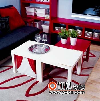 在家具的擺放上也有一定學(xué)問,要事先考慮到人行通道與家具之間的關(guān)系,讓家具與主人活動的空間保持一定距離,盡量別在空間上發(fā)生沖突。于是將做收納用的小墩收放在茶幾之下,不僅功能沒有受到影響,而且將空間變得有序而整潔,而四個款式、型號完全相同,色彩有所變化的小茶幾可以根據(jù)功能需要隨時轉(zhuǎn)換拼接方式。