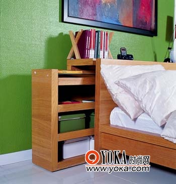 床后背板的設(shè)計不僅可以擺放一些經(jīng)常要用的東西,起到床頭柜的作用,而且板下的空間可以隱藏一些不常使用的零碎物件,但一定要給板下的柜子裝上靈巧可滑動的滾輪,否則一旦放了重物,推拉就成問題了。