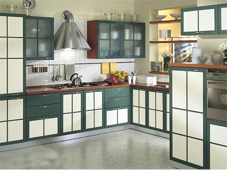 使用實木制作櫥柜門板,風格多為古典型,通常價位較高。其門框為實木,以櫻桃木色、胡桃木色、橡木色為主。門芯為中密度板貼實木皮,制作中一般在實木表面做凹凸造型,外噴漆,從而保持了原木色且造型優(yōu)美。這樣可以保證實木的特殊視覺效果,邊框與芯板組合又可以保證門板強度。