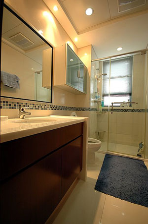 衛(wèi)浴間用馬賽克鑲邊打造低調(diào)的奢華感覺,吊頂采用石膏板和鋁扣板結(jié)合,讓頂部風(fēng)光更富有層次感。