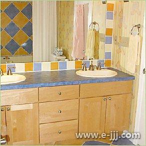 在一個(gè)中性的浴室內(nèi)可以增加浴室瓷磚的互補(bǔ)色,設(shè)計(jì)師Katie Leavy使用12×12的藍(lán)色和金色磚在地板和浴盆周?chē)伋尚奔y,在鏡子周?chē)?×4的瓷磚做成一個(gè)框架。