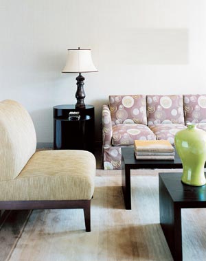 極致簡約而略嫌生硬的現(xiàn)代家具,會(huì)因布藝與飾物的裝點(diǎn)變得生動(dòng)。造型上的方與圓,材質(zhì)上的棉與麻,色彩上的白與綠,看似不很和諧的元素,也能在巧妙的混搭中,呈現(xiàn)隨性的舒適感。