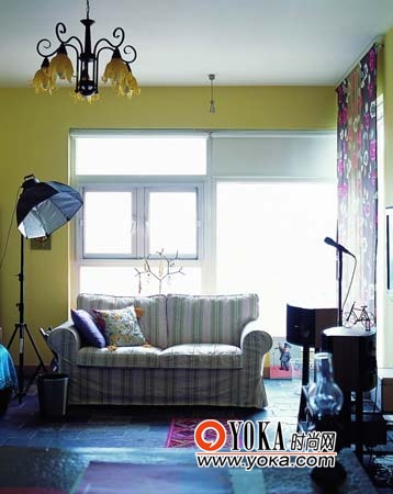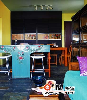 青衣吧臺,是好友推杯換盞相言甚歡的地方,然而對于盧婕寧來說,一個難忘的party,光有酒還不夠。還缺什么?歌聲!盧婕寧平時就是K歌房里的麥霸,可以在家里放歌是她長久的愿望。于是,客廳的沙發(fā)中間沒有按常規(guī)放茶幾,而是擺到沙發(fā)的背后去了,這樣就多了一塊空地,用來開盧婕寧的小型演唱會!話筒架是從裝修時認識的賣音響的朋友處淘來的,吧臺上的射燈正好照到空地中間的位置?!芭笥褌兛梢宰陂胶蜕嘲l(fā)上,而我坐在中間的吧凳唱歌”,這就是盧婕寧簡單的愿望。