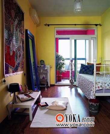 小臥室里一幅異域色彩的手工掛毯旁,是主人設(shè)計的巨大穿衣鏡,軟軟的靠包隨意擺放,讓人有席地而坐的沖動。
