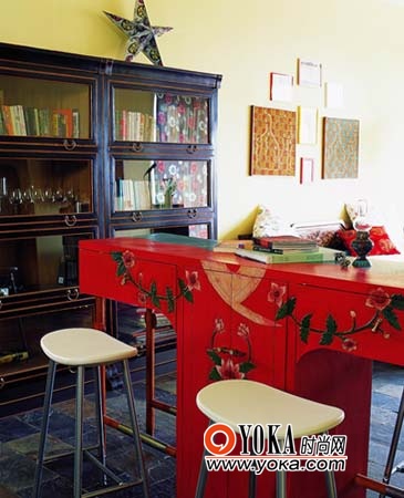 客廳里需要一個可以喝酒聊天的地方,盧婕寧便想到要做一個帶酒柜的吧臺,不但能夠放酒,還可以讓眾人落座,帶著這些目標功能開始動筆,最終定稿成為一個中間部分落地,用來放酒,兩邊展開的部分形成桌面,畫到這里發(fā)現(xiàn)它看起來像一件衣服,而且還是件青衣!索性找來葉錦添給游園驚夢設(shè)計的服裝做參考,自己畫了花的樣子,讓木匠去做。木工師傅看到設(shè)計圖非常喜歡,一直夸說這樣的柜子會很好賣,這讓盧婕寧大大得意了一番。整個作品完成的時候,可以用驚艷來形容,簡潔的造型,鮮明的色彩,精細的紋樣,頗有新古典主義的意味。最重要的,這是主人百分百的原創(chuàng)!