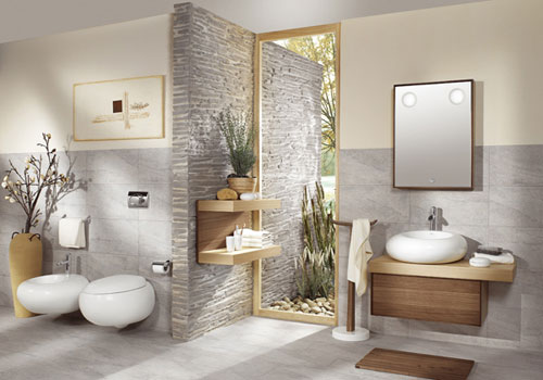 墻面的處理方式應(yīng)該是盡可能地富有想像力,要不就盡量求簡(jiǎn)。在水泥墻上涂上一層油漆會(huì)使浴室增添暖度,而馬賽克玻璃磚,刻花磁磚,甚至板舌以及凹槽處理都能使墻壁的設(shè)計(jì)更為有趣。